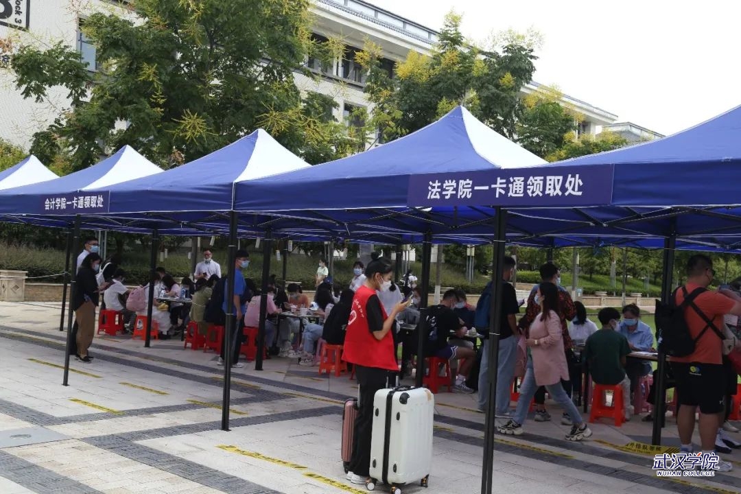 在各个院系帐篷旁,五彩绚丽的易拉宝各显神通,明列入学须知、详细介绍专业、公布往届学生毕业去向、在办理好入学手续的同时助力新生熟悉学校。领取军训服和各学院办理一卡通的地方也拉上了引导线,组织学生有序排队,避免混乱聚集,多台录入设备和众多工作人员也轮班上岗,保障一卡通激活。