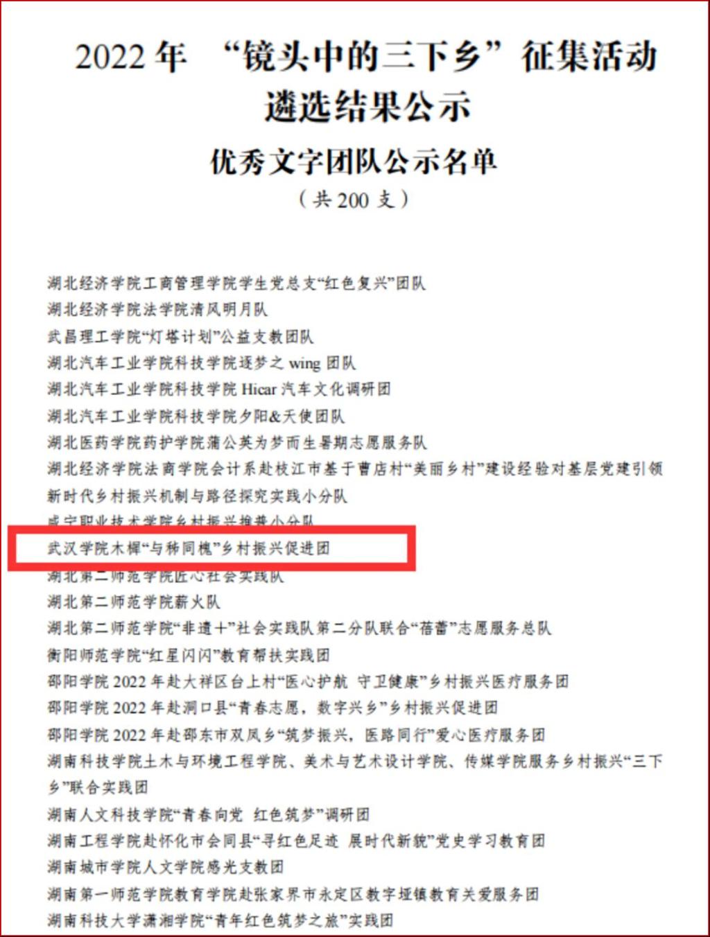 今年“镜头中的三下乡”活动,旨在以优秀的实践影像和报道作品记录青年学生投身乡村振兴的生动实践,展现青年学生喜迎二十大、永远跟党走、奋进新征程的靓丽身影,凸显青年一代贡献青春、建功立业的时代风采,帮助青年学生在社会实践中受教育、长才干、作贡献。评选活动经过实践调研、资格审核和专家评审等多项环节,PG电子木樨“与秭同槐”乡村振兴促进团从全国三千支实践团队中脱颖而出,取得佳绩。