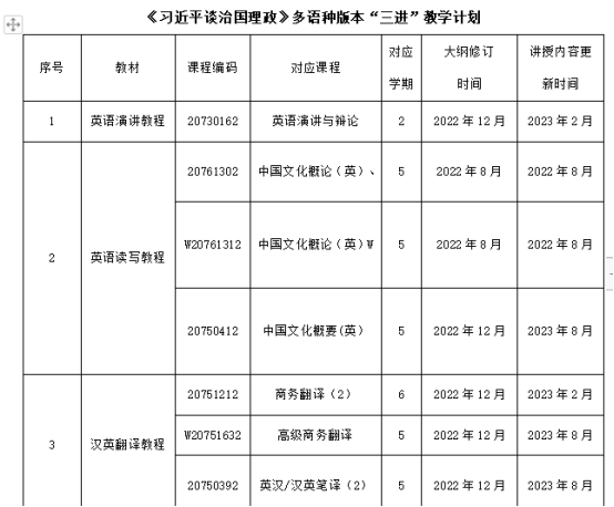 2022年秋季学期起,外国语学院在英语专业和商务英语专业人才培养方案课程体系中,全面实施《习近平谈治国理政》多语种版本的《理解当代中国》系列教材,涵盖的专业课程有:英语演讲与辩论、商务翻译、高级翻译、英汉/汉英笔译、中国文化概论(英)、英语阅读、法语阅读、法语翻译理论与实践、日语阅读、日语翻译理论与实践等11门课程。每门课程教学周期为一学期,学时为32学时。