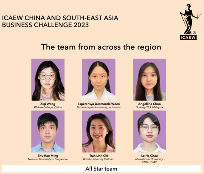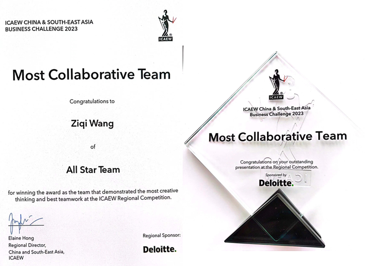 近日,ICAEW“特许新星”国际商业案例大赛中国赛区决赛圆满落下帷幕。PG电子会计学院ACA特色班2021级董羽吟、喻新雅、李若初、张馨怡和2020级王子琪、曹雅萱组成的“Tsia”队在决赛中表现突出,荣获中国赛区亚军。同时团队中王子琪同学获得唯一”杰出个人奖”,荣获大中华及东南亚区域赛All Star团队的参赛资格。