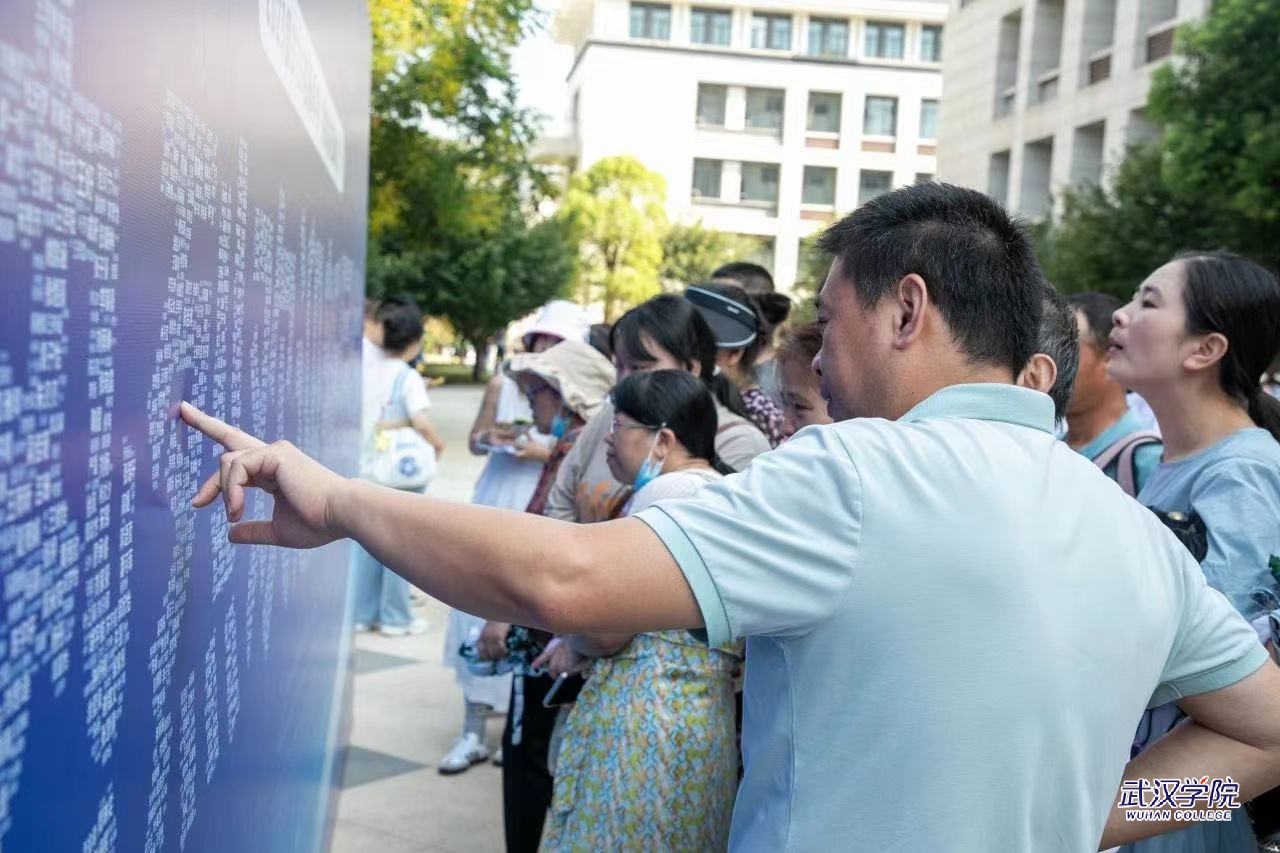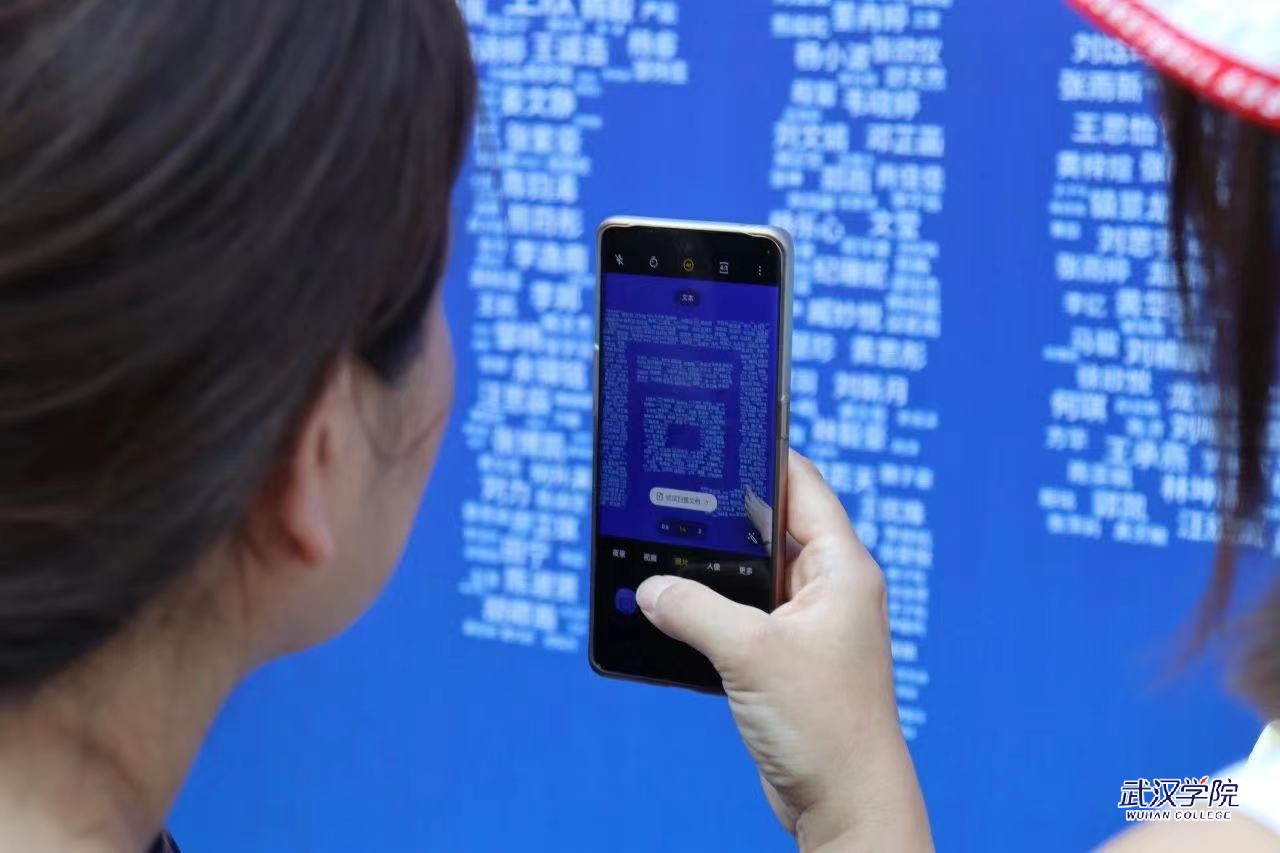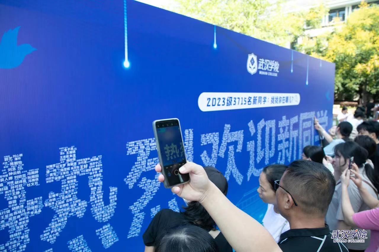 为迎接新生的到来,校园内布置了道旗、展板、指示牌等,一派新气象。其中企鹅广场前一块印有“热烈欢迎新同学”字样的大展板吸引了众多学生和家长驻足围观。这块远看只是一句迎新标语的展板,近看却暗藏玄机,展板上的几个大字是由全校3715名新生的名字组成的。展板前新生忙着和自己的名字拍照打卡,家长也忙着用手机拍下这珍贵的一幕。