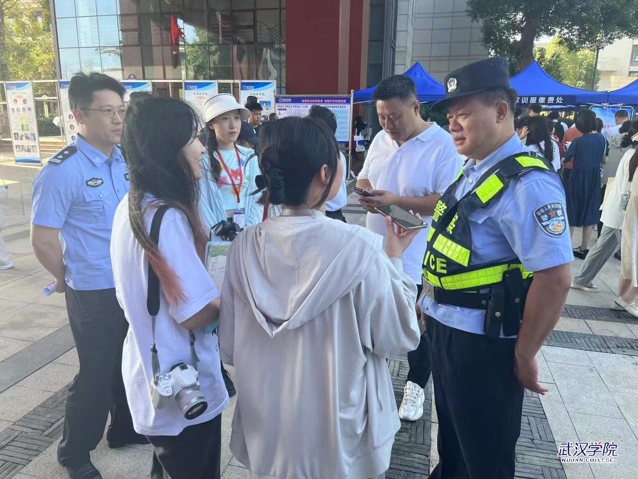 作为疫情后首个迎新日,校园车水马龙,人潮川流不息,人群中还活跃着几位和蔼可亲的警察叔叔。武汉市公安局文化保卫局设立了护学护校宣传点,向新生宣讲反诈骗、消防安全等知识。