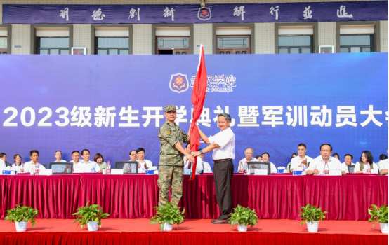 校党委书记陈祖亮教授向军训团授团旗,军训团团长、武汉市民兵应急营副营长朱亮同志作开训发言,为期两周的军训随之拉开序幕。