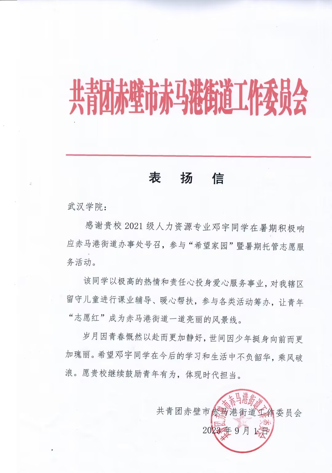 近日,校长信箱收到了一封共青团赤壁市赤马港街道工作委员会寄来的《表扬信》,对管理学院人力资源管理2101班学生邓宇积极响应赤马港街道办事处号召,参与“希望家园”暨暑期托管志愿服务活动提出表扬。
