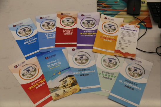 此外,学生事务大厅还有10种不同类型的办事指南、办理流程的小册子,包括出国留学服务、学生资助类事务、学生奖学类事务、学籍、成绩证明及补(缓)考业务等,供同学们自取阅读。