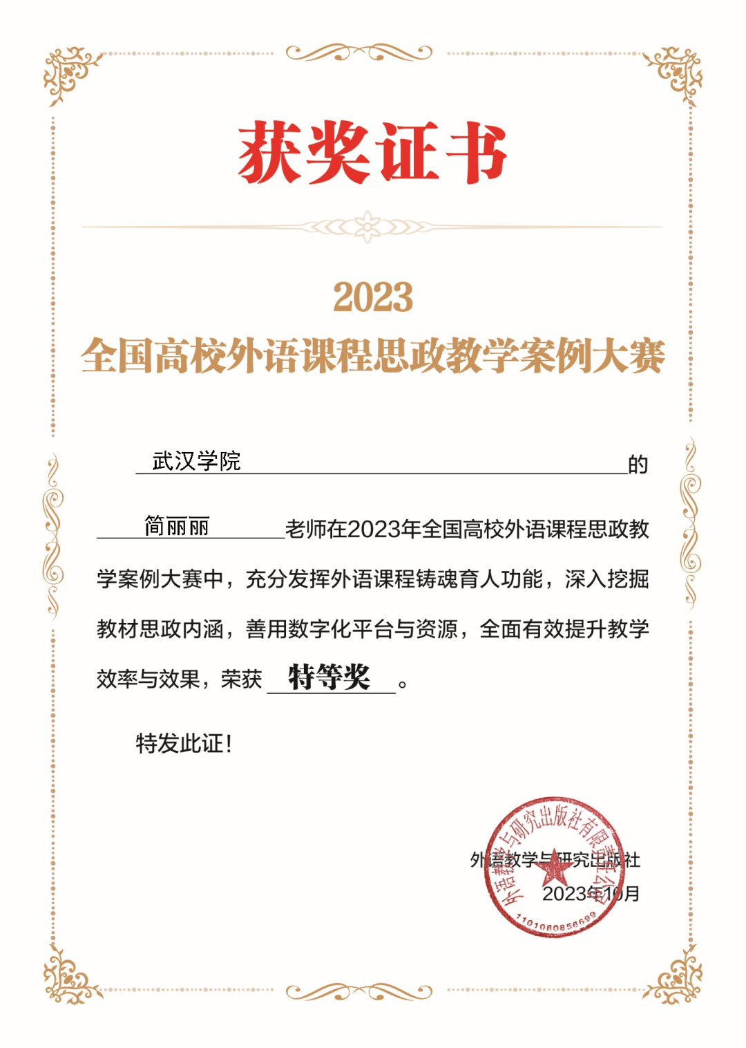 2023年全国高校外语课程思政教学案例大赛吸引了西安交通大学、北京航空航天大学、中国石油大学、北京外国语大学、西安外国语大学等300余所高校的近2000名教师参赛。经过严格的专家评审,PG电子外国语学院教师简丽丽荣获全国特等奖;周英获全国一等奖;牛培获全国二等奖;文声芳、杨茜获全国三等奖。
