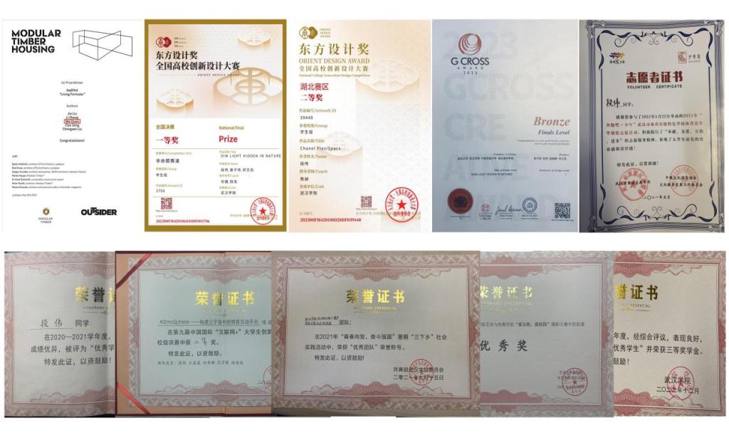 从默默无闻到在众多国际国内比赛的舞台中脱颖而出,段伟经历了无数挑战和挫折。但他并没有被击倒,相反,每次失败都成为了他积累经验、吸取教训的机会,使他变得更加坚韧。他深信:“别人可以,自己当然也行!”随着时间的推移,他的努力终于开始得到回报。今年3月,段伟和团队成员一起参加由斯洛文尼亚媒体组织 Outsider magazine 与 Modular Timber™ 合作发起的模块化木屋国际设计竞赛,经过激烈角逐,团队提交的“Living Formular”方案赢得本次国际竞赛第一名,并获5000欧元竞赛奖金。段伟也经常活跃在各项国内赛事中,他的设计作品曾荣获东方设计奖·全国高校创新设计大赛一等奖、第九届中国国际“互联网+”大学生创新创业大赛省级铜奖和G-CROSS创意金星奖等奖项。