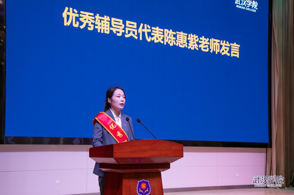 优秀辅导员代表陈惠紫发言,她表示教育是一条充满阳光的道路,她愿意成为其中的一束微光,继续把学生成长成才作为职业理想与追求,坚定理想信念、坚定奋斗意志、坚定恒信韧劲,以履职尽责、担当作为的实际行动在本职岗位上发光发热。