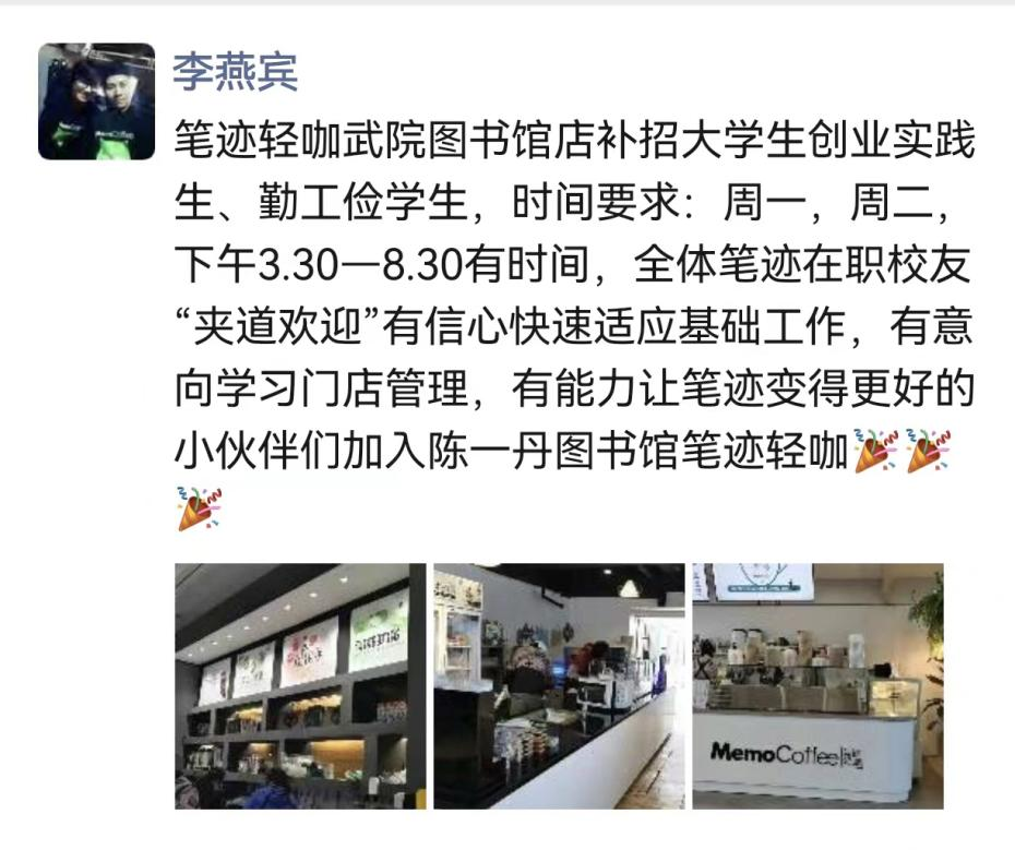 李燕宾说,像这样喜爱餐饮行业、愿意扎根于此的大学生很少见,希望未来有更多这样的学弟学妹加入创业团队,一起把“笔迹轻咖”经营成为一个市场认可、受人尊敬的品牌。