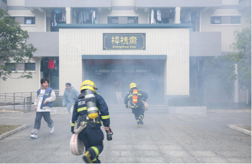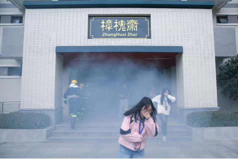 消防演练正式开始。樟槐斋三楼突发“火情”,大量浓烟出现。随着烟雾报警器响起,宿舍里的学生察觉失火情况,在疏散组工作人员的指引调度下,纷纷捂住口鼻,弯腰低势行进,迅速有序撤离到安全地点。