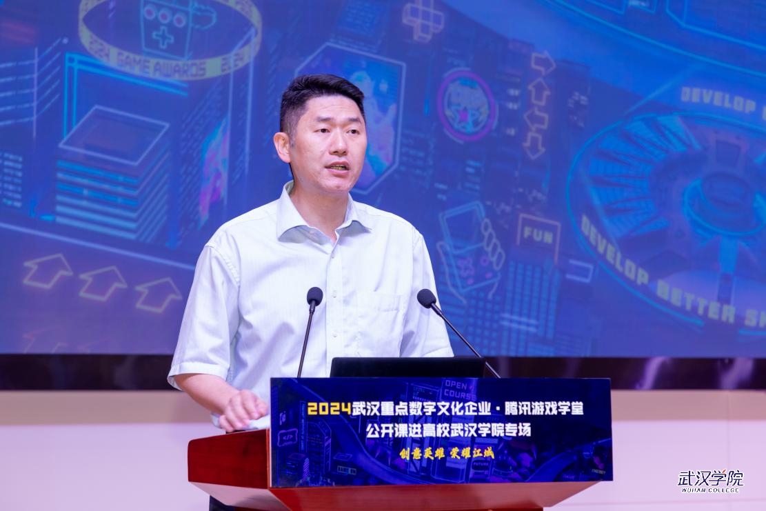 腾讯游戏学堂校企合作负责人杨夏君为在场师生推介2024武汉文化创意设计大赛暨腾讯游戏创作大赛,大赛聚焦游戏数字文化、数字科技领域,以“游戏”为媒,构筑英雄城市的文化新印象。