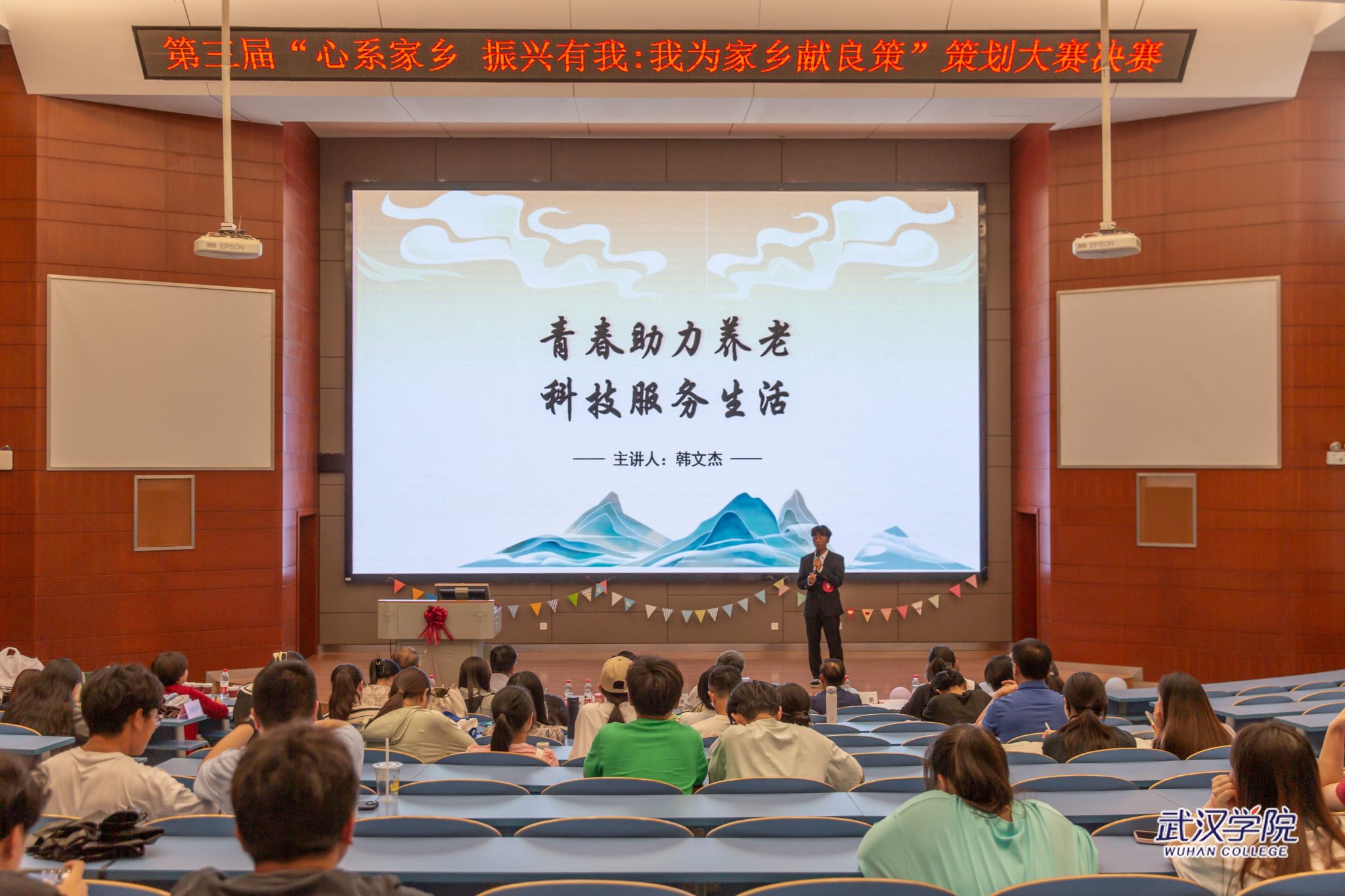 来自金融与经济学院的向佳璐分析了家乡恩施在旅游业方面存在的问题。她从交通和住宿等方面提出建议。通识教育课部的韩文杰将关注重点放在社区人口老龄化的问题上。他以大学生身份思考“如何让身边的老年人‘老有所养、老有所依、老有所乐、老有所安’”,提出《青春助力养老》策划案。值得一提的是,韩文杰将策划案付诸实践,与体育系20多位同学组成志愿服务队,深入社区传授老年人使用电子设备,借助自身专业优势开设中医养生班,为社区老人提供健康服务。