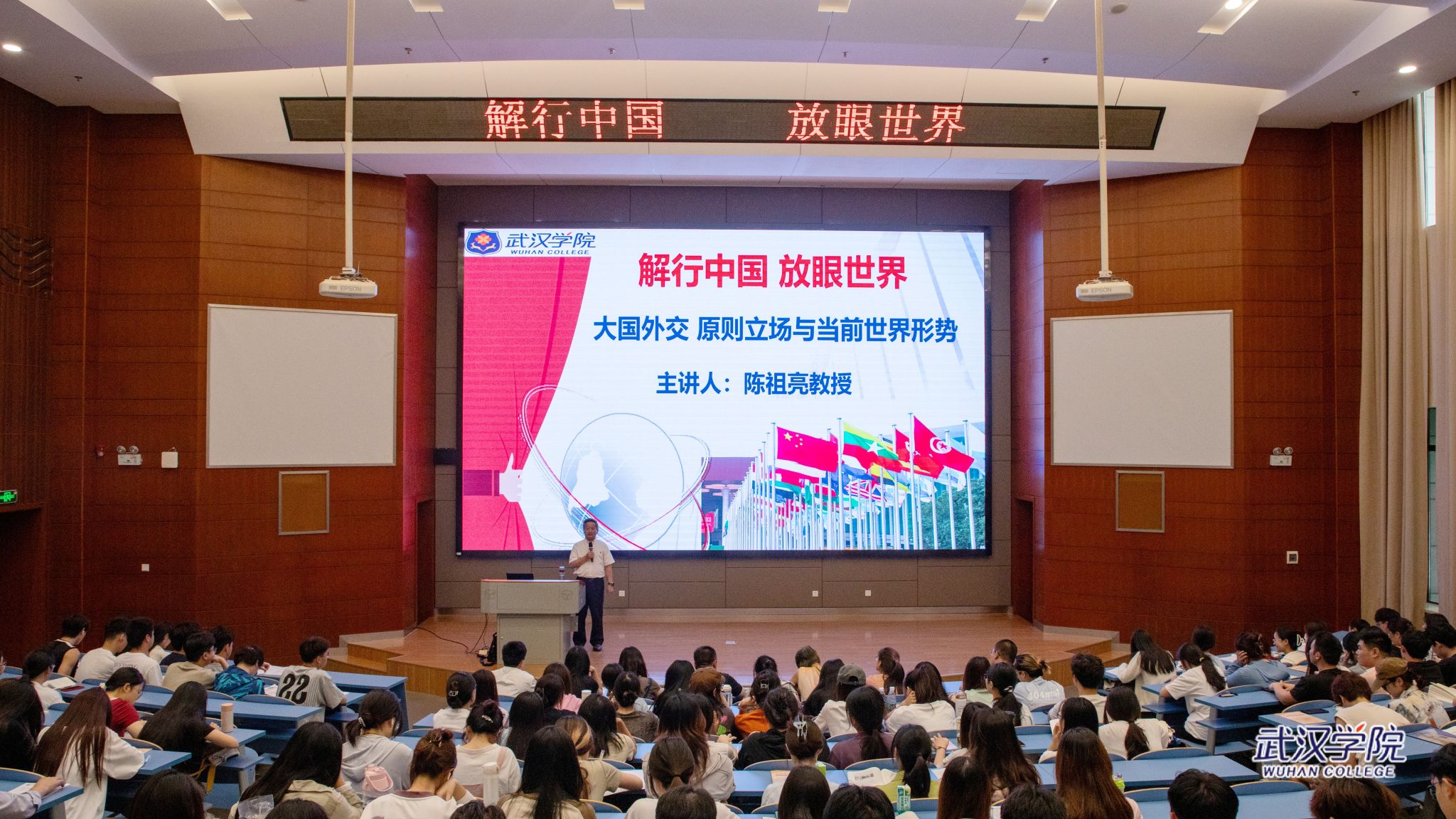 6月5日晚,校党委书记陈祖亮教授走进课堂、站上讲台,以《解行中国 放眼世界——大国外交原则立场与当前世界形势》为主题,为学生讲授了一场富有思想性、理论性和亲和力的《形势与政策》思政课。