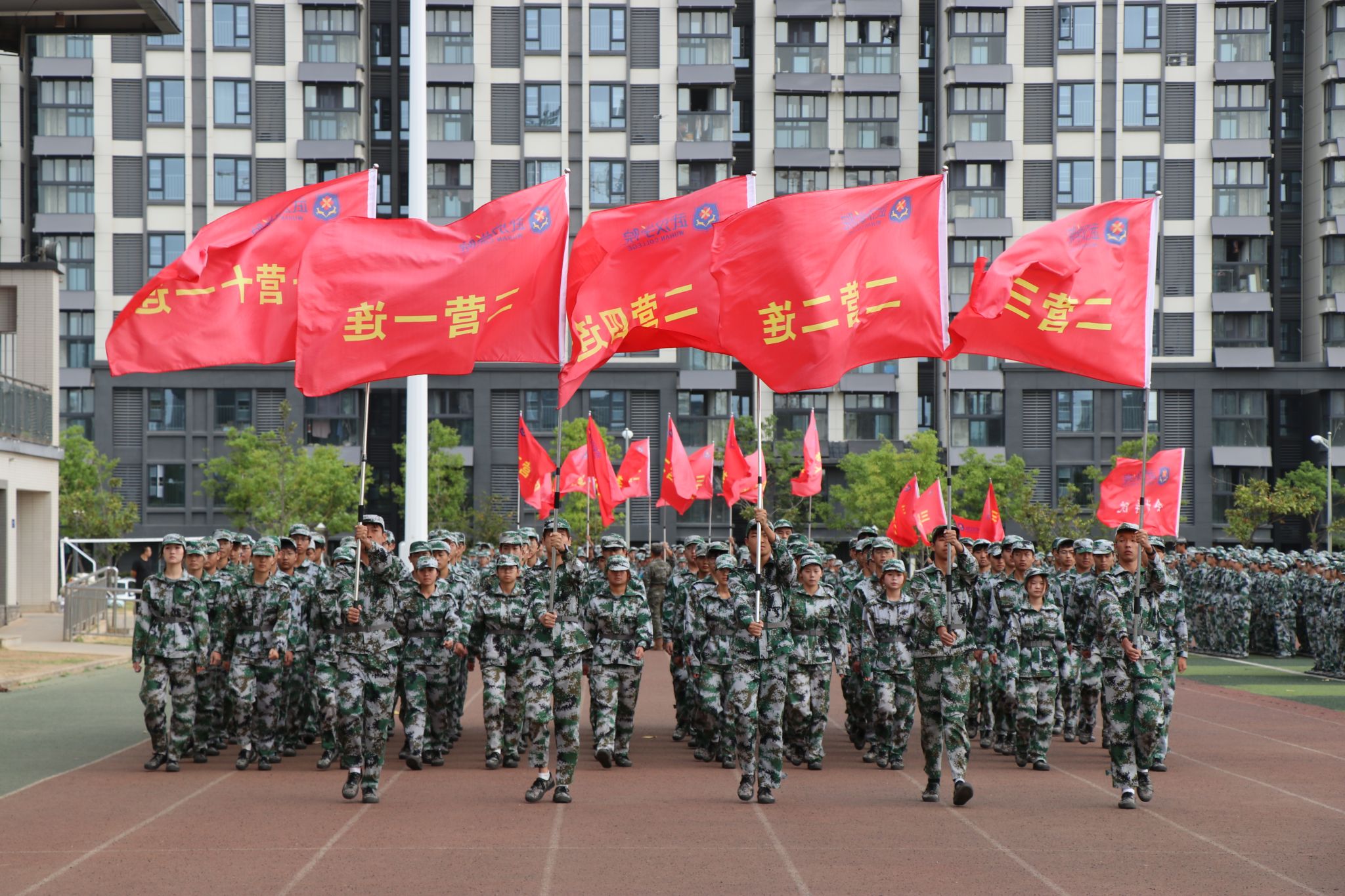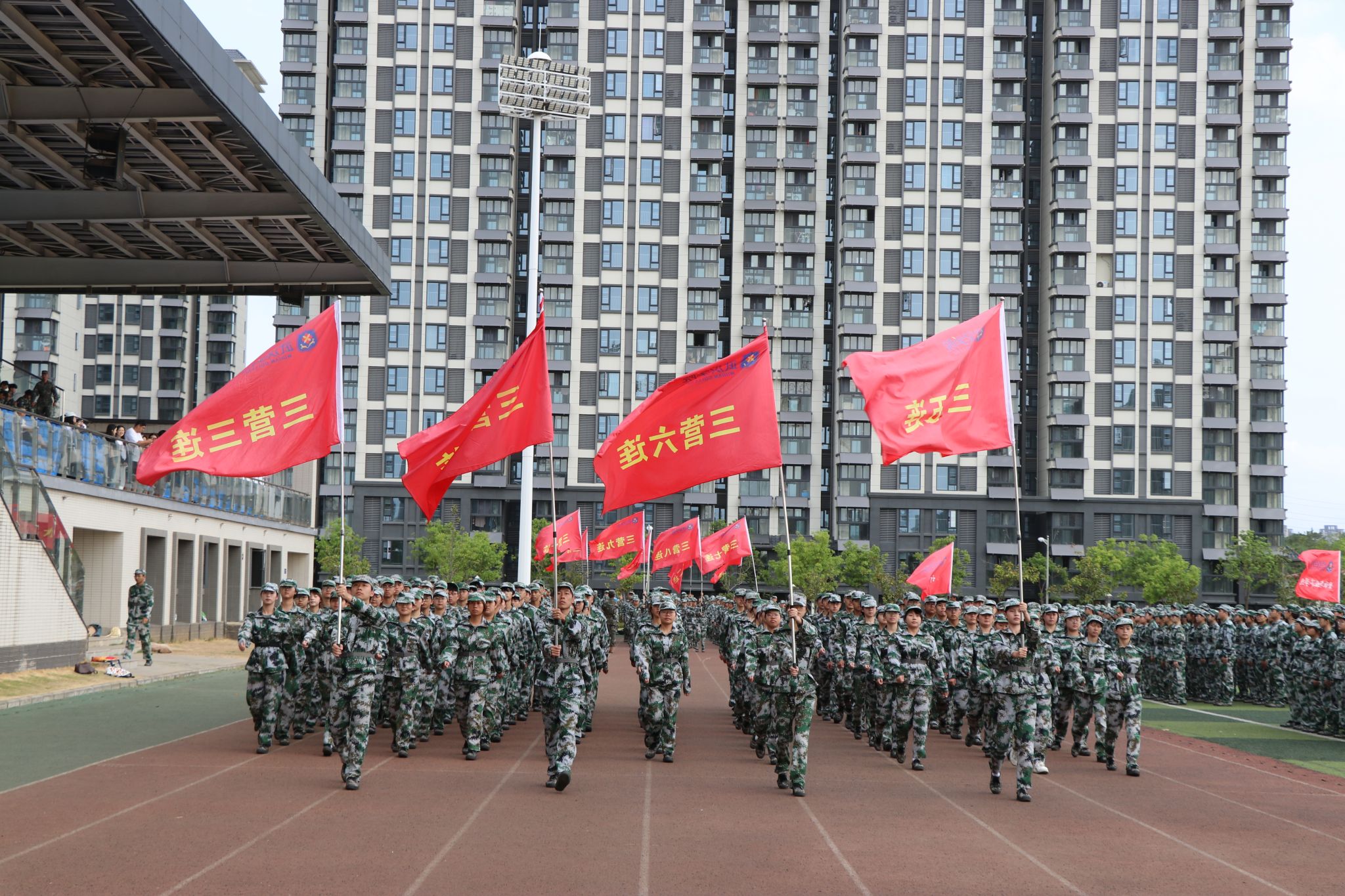 跟随着巨幅党旗、国旗和校旗,各学院方阵、连队依次走过观礼台,步伐整齐、口号嘹亮、军姿飒爽。