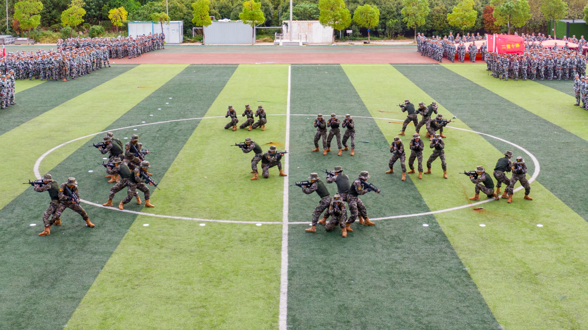 教官展示分为战术手语、射击姿势转换、小组队形行动三个部分。烟雾中,教官们的每一个动作都彰显专业素养,从前进、停止到隐蔽,每个手势指令准确无误;前进、翻滚、匍匐,从立姿到跪姿,每次变换干净利落、行云流水;从紧密集结到疏散成线,每种队形调整演绎团队力量。