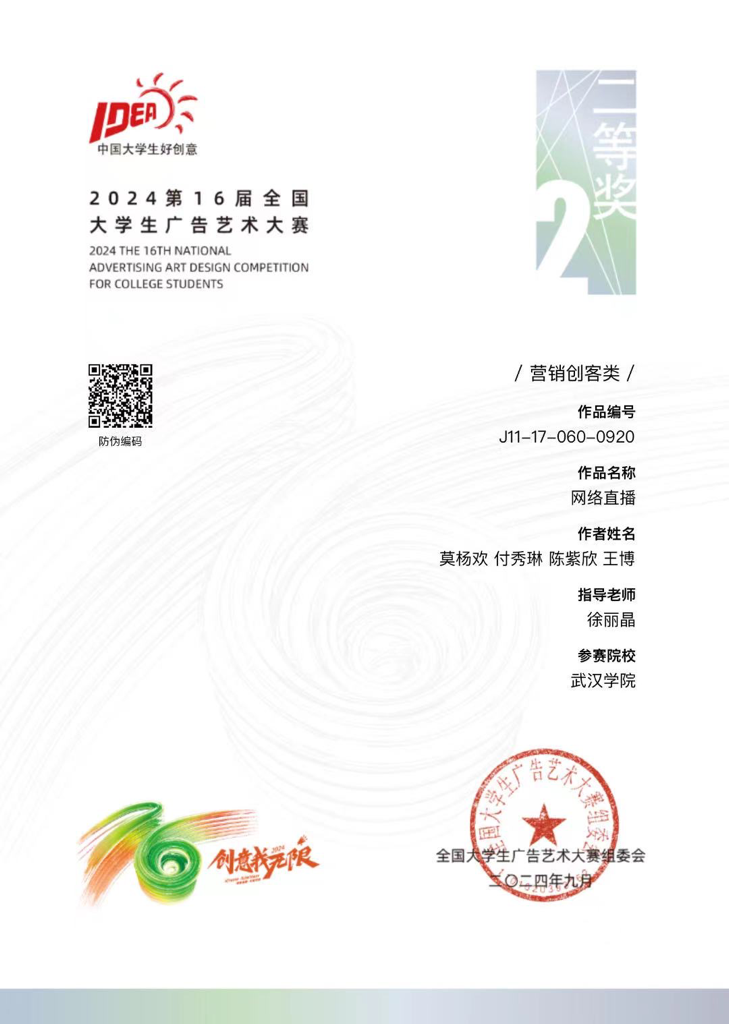 第16届全国大学生广告艺术大赛决赛近日落幕,PG电子学生肖依春团队获得直播赛道一等奖,冯之成团队和莫杨欢团队获得直播赛道二等奖。