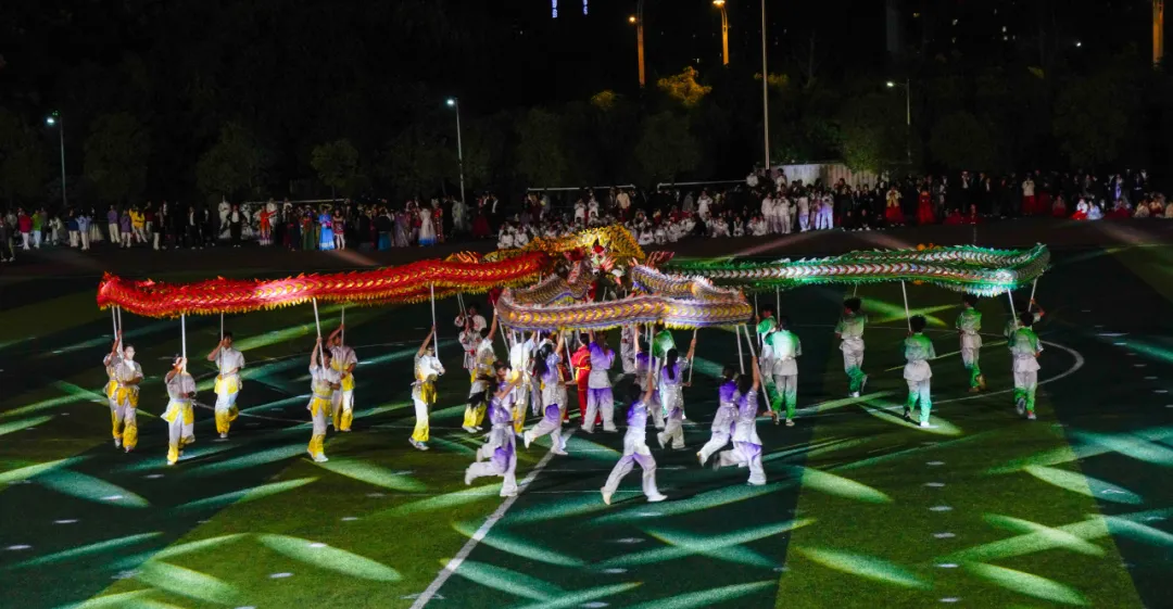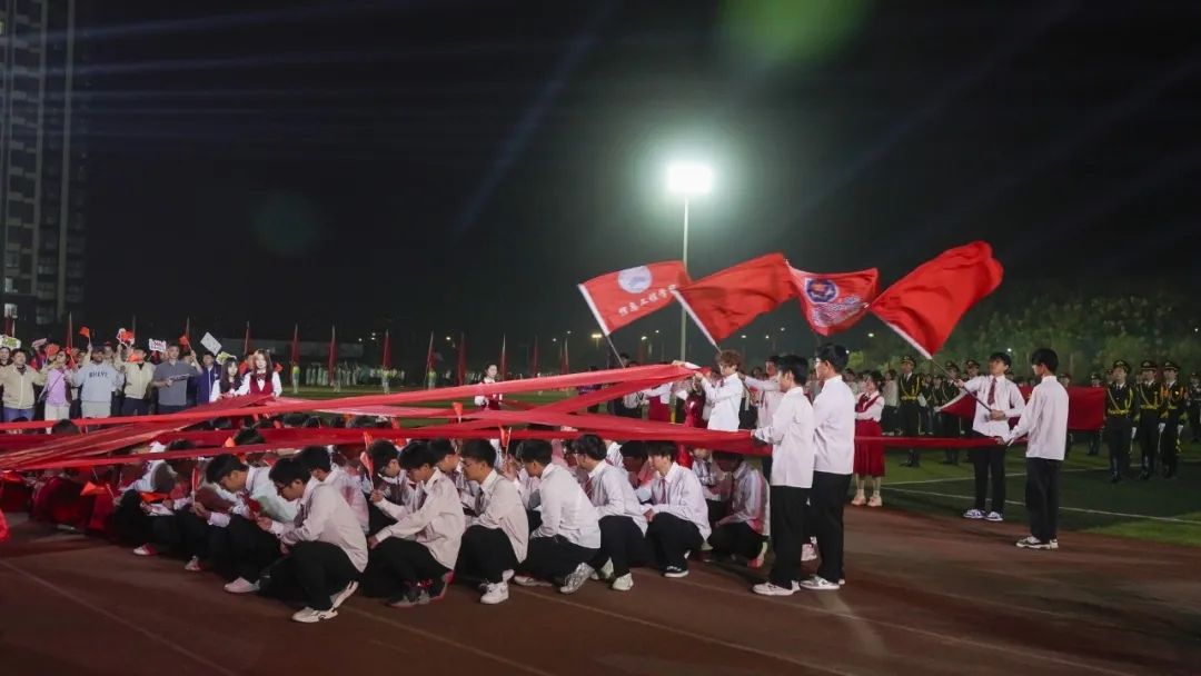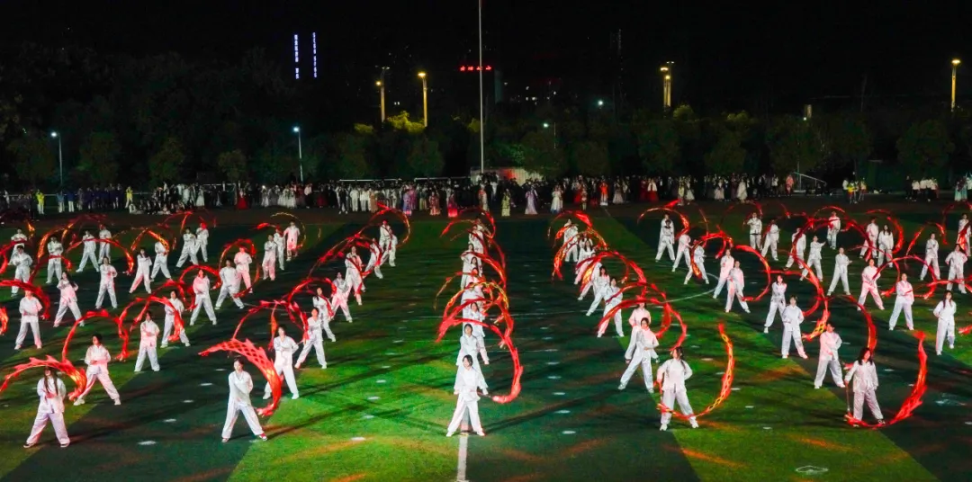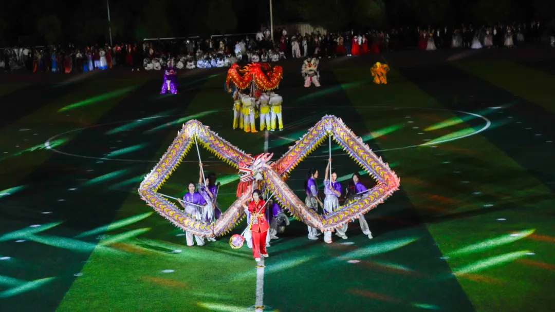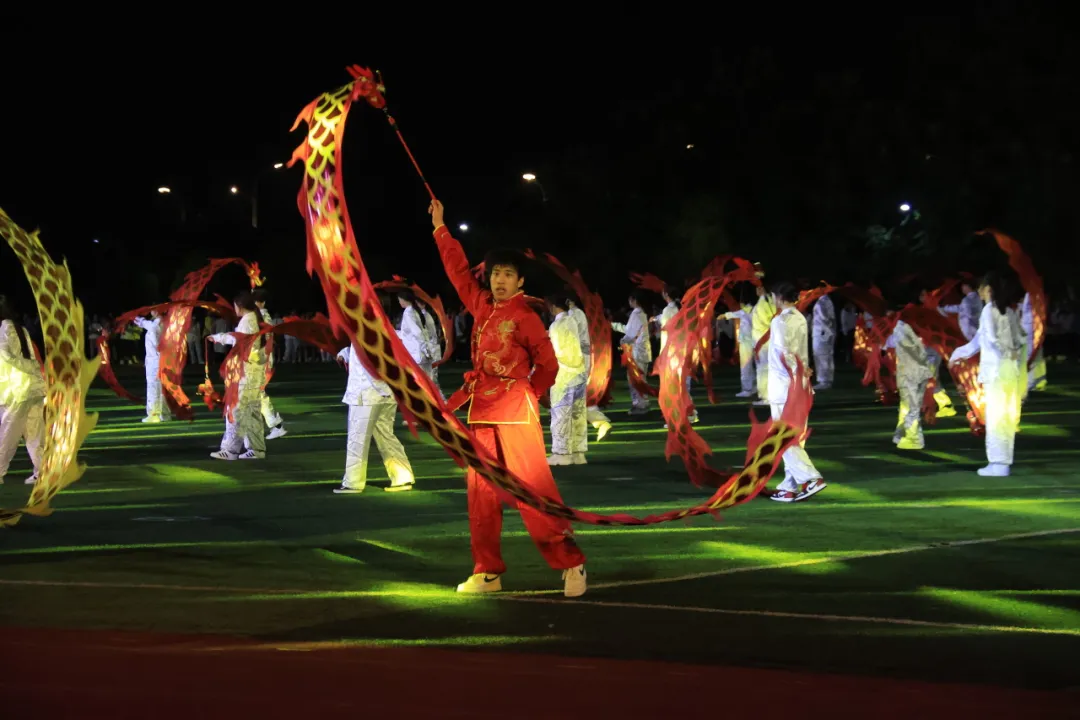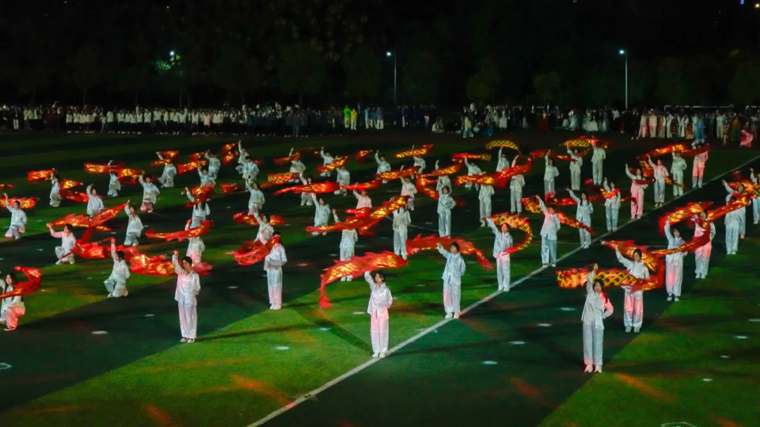 九十九位表演者统一身着白衣,手执红绸,随乐跃动,丝带翻飞交织,化作灵动的龙形。光影交错中,操场中央显现出一颗璀璨夺目的五角星,由几色丝绸进行编织而成,象征着团结与希望。