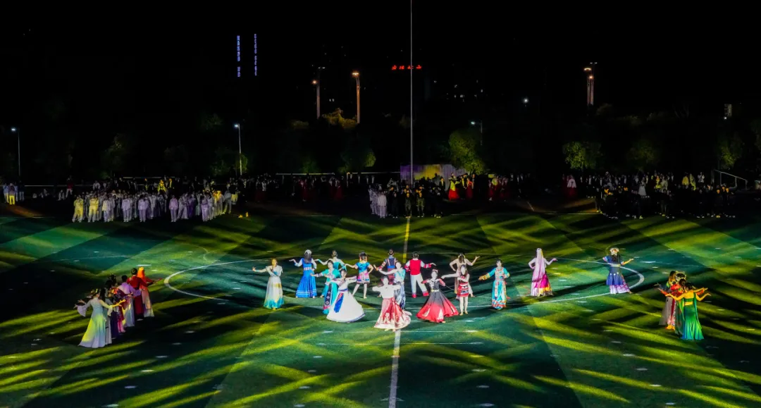 操场中央,青春靓丽的女学生身着各族华服,步伐轻盈,舞姿曼妙,展现着多元文化的和谐共融,每一旋转、每一摆手都透露出不同民族的独特风情,共同绘就一幅多姿多彩的舞蹈长卷。