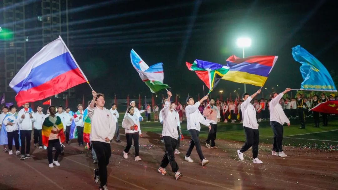 文体表演结束后,国旗、校旗、会徽、红旗方阵入场。紧随其后,各学院方阵依次入场,他们结合专业特色“各显神通”,带来了丰富多彩的表演。留学生们披着各自国家的国旗入场,校运动会瞬间有了“国际范儿”。