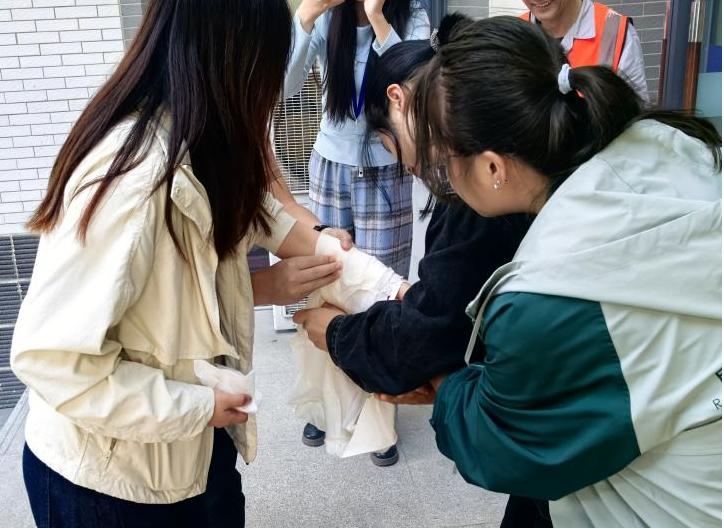 模拟火灾现场浓烟滚滚,警报声迅速响起。师生在工作人员的引导下,用湿毛巾捂住口鼻,弯腰低姿,快速有序地从教学楼疏散至安全地带,展现出良好的应急反应能力。消防队员行动敏捷,冲向“火灾现场”。消防车高压水枪强力喷水,消防员手持灭火器压制火势。发现有 “伤员” 被困后,不顾危险冲入 “火海”,救出 “伤员” 并进行急救处理。模拟活动现场组织有序,各小组人员配合默契。