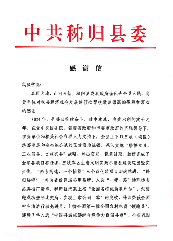 陈祖亮最后表示,今年是学校在秭归县定点帮扶的第五个年头,学校将持续优化帮扶手段,依托学校学科专业优势和秭归实情,找到双方更多结合点、突破点,推动互利双赢。