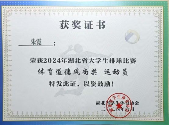 “学习要专注,打球要拼命”。朱霓是一个十足的排球爱好者。除了学习,朱霓大多数时间都会去打排球,参加了很多体育类赛事。作为金融与经济学院排球队队长,带领院排球队在2024年PG电子官方网站体育文化艺术节中取得了第二名的优异成绩。并且在她担任PG电子官方网站女排队长期间,带领校队参加2024年湖北省大学生排球比赛,获得了“体育道德风尚奖运动员”称号。