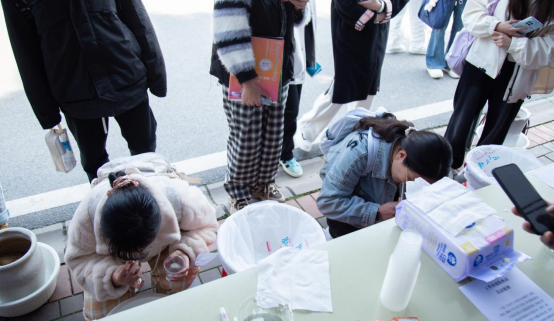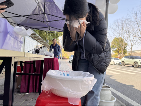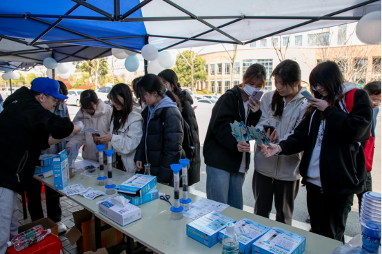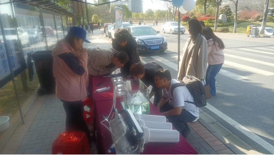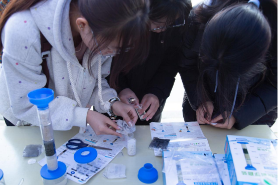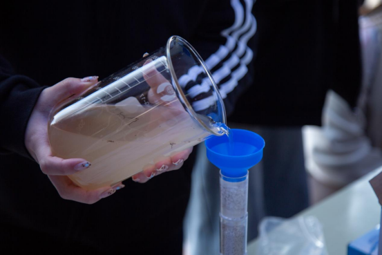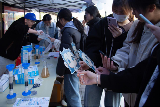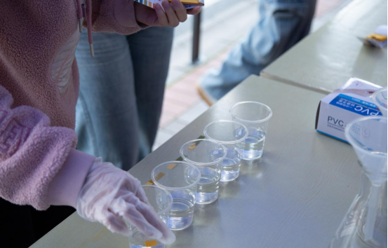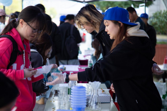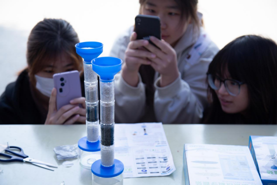 师生们亲手操作微型污水处理装置,通过石英砂、瓷沙和活性炭等试剂的物理吸附作用,钾明矾和小苏打的化学沉淀法进行简单的污水净化实验。除污水处理外,饮用水pH值检测也备受师生欢迎,更有同学拿自己喝的可乐到现场测定pH值,参与实验的夏同学直呼:“好像回到了中学时代,老师带我们做实验一般,真真‘爷青回’!”