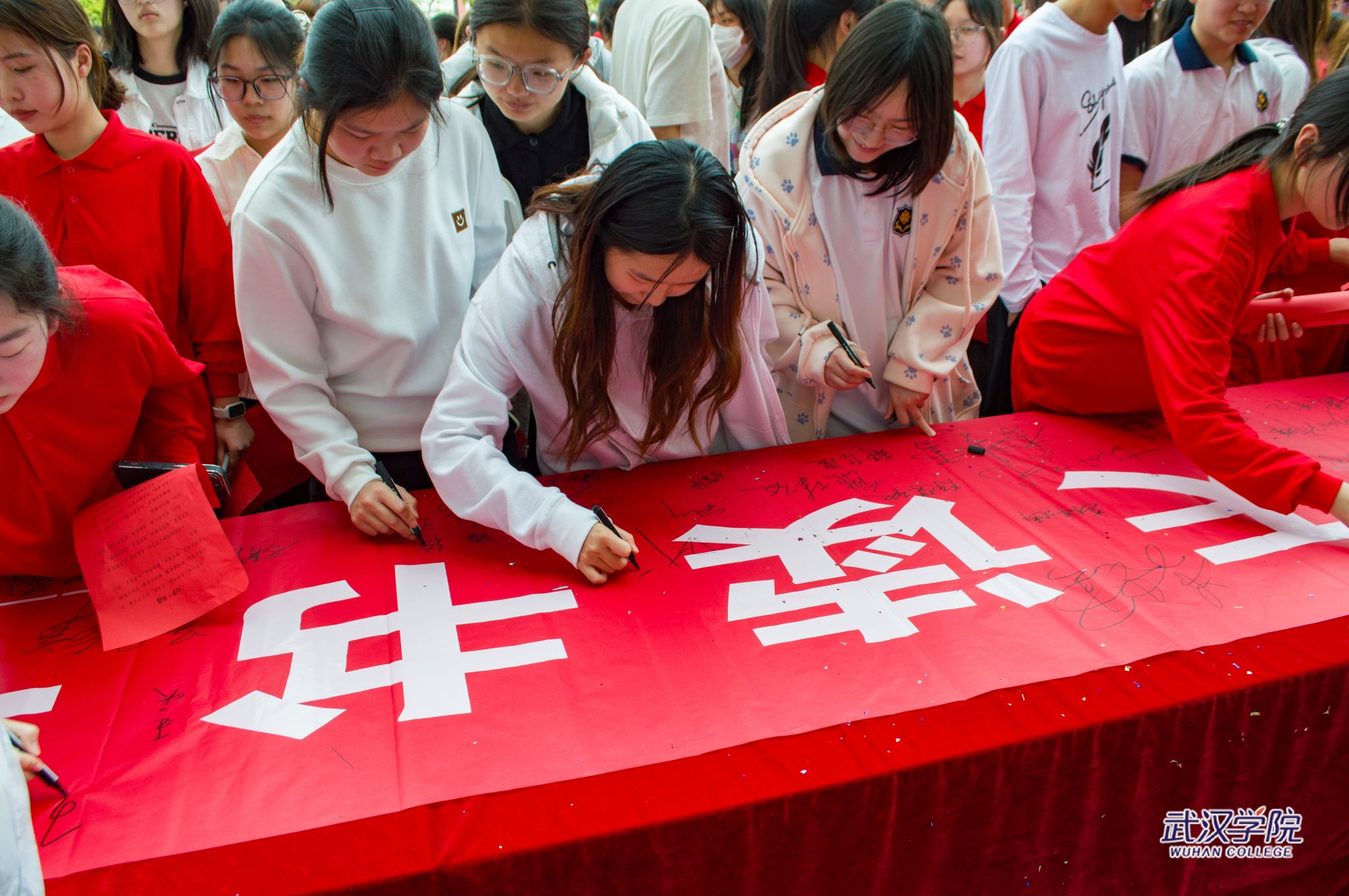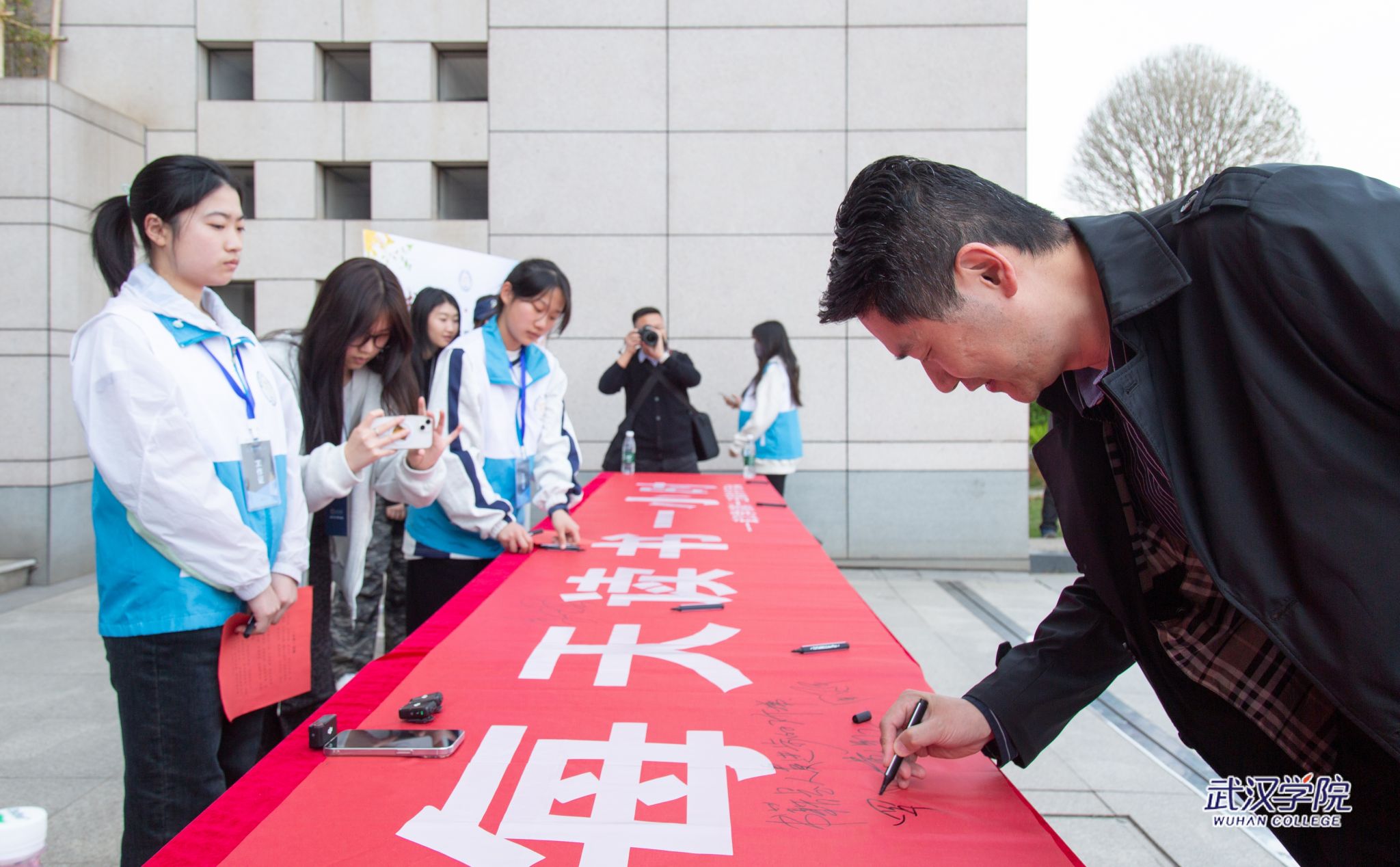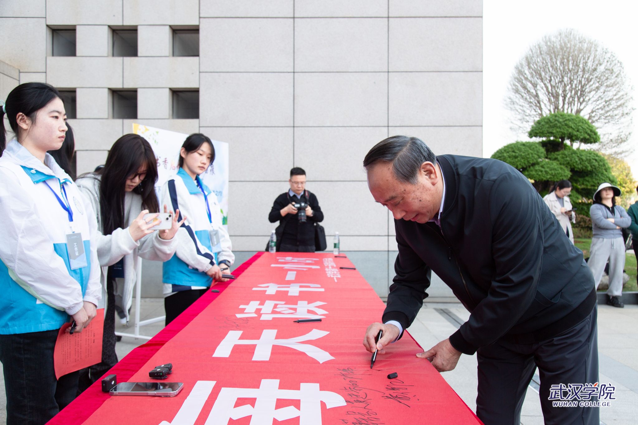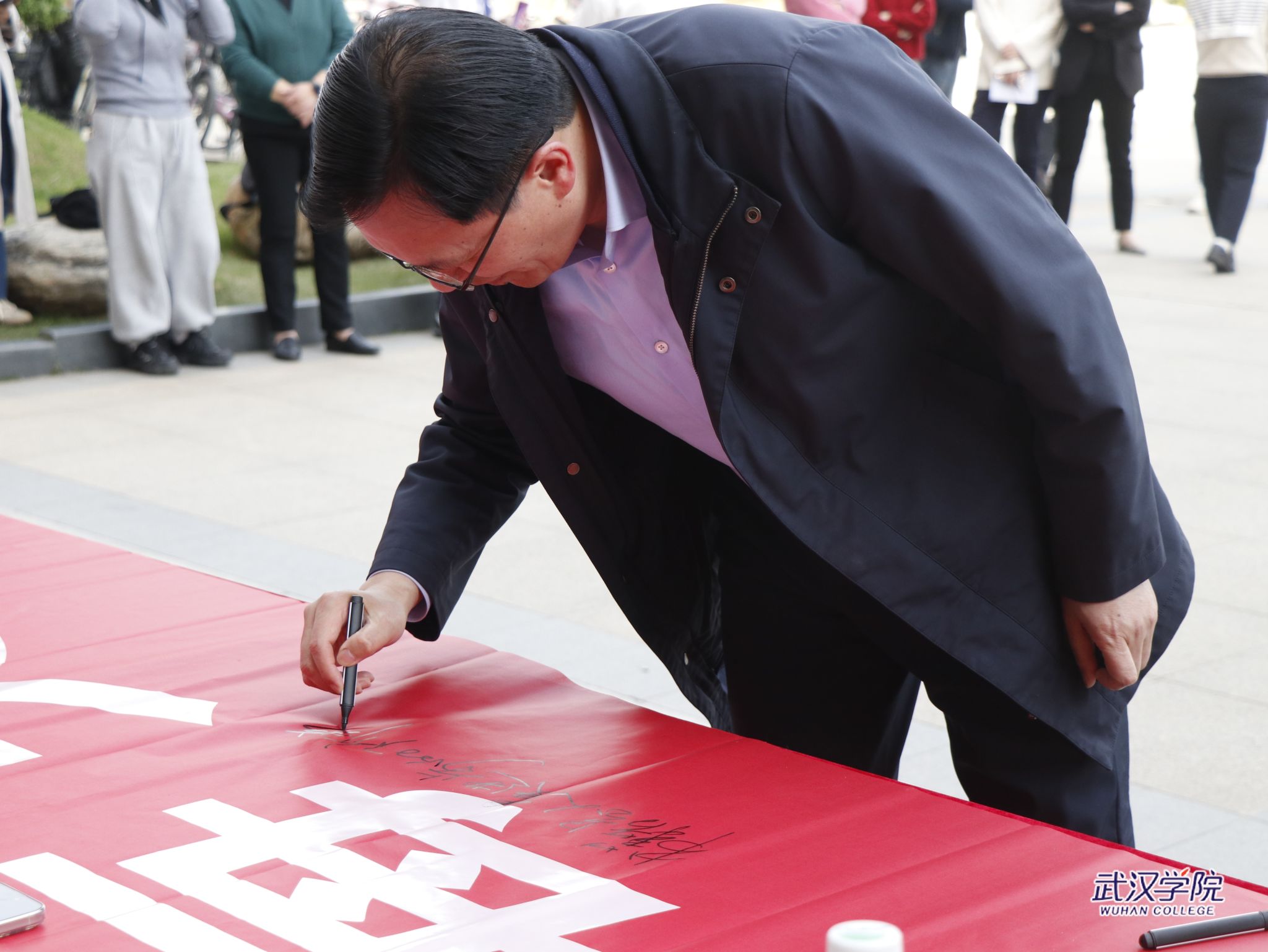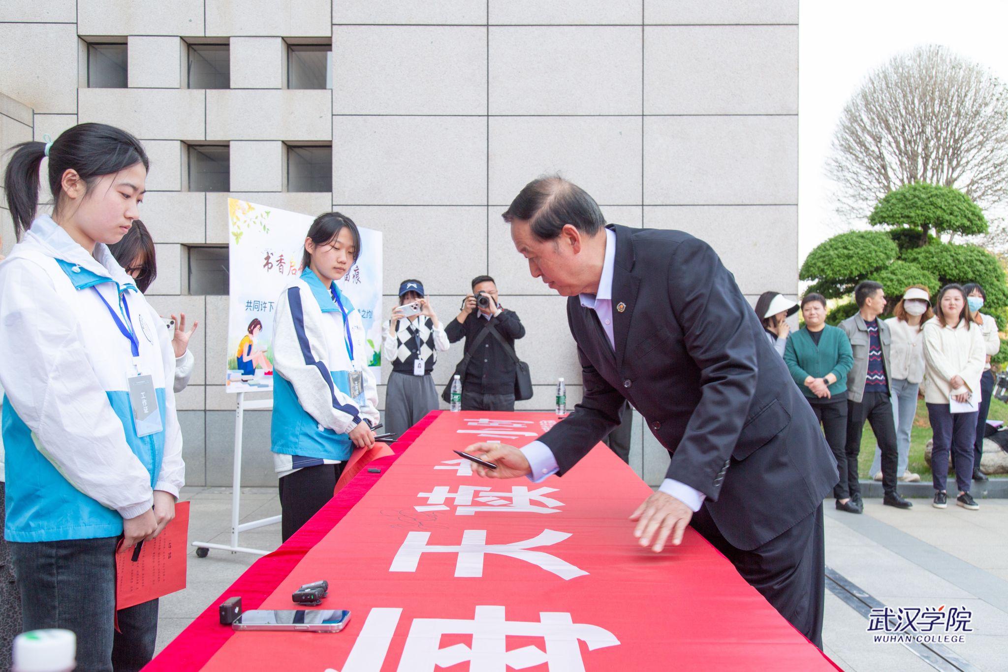 党委副书记、副校长黄保红在“每天阅读一小时”横幅上签名(摄影:刘小雯)