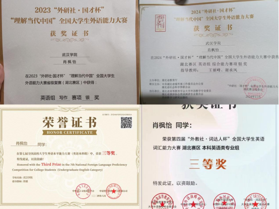 肖枫怡开始积极主动参加“国才杯”“词达人杯”等各类英语竞赛。起初,她害怕自己能力不足颗粒无收,但是500多分的英语四级成绩让她鼓起勇气再次尝试。参加“国才杯”英语竞赛时,肖枫怡发现自己在写作和翻译方面颇具优势,便将参赛方向确定为写作赛项。英语专业比赛是一个人单打独斗的赛场,主要考查学生个人的专业能力。肖枫怡告诉记者,“‘国才杯’是一个综合性的赛事,不仅考察专业能力,还考察中国传统、时政、科技等诸多方面的知识,因此我需要了解大量课外知识。”她采取“宁可错杀绝不放过”的备战方法,将能收集到的所有资料进行练习、背诵,最终斩获写作赛项省级银奖。