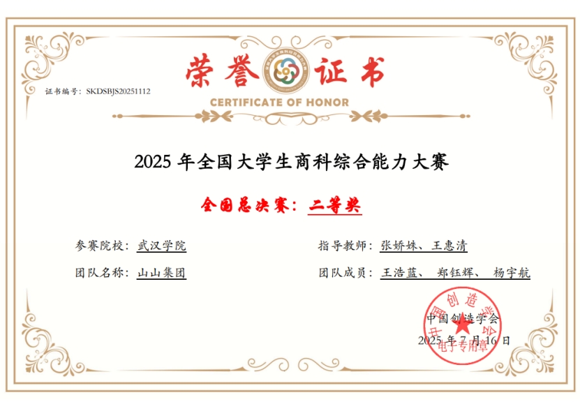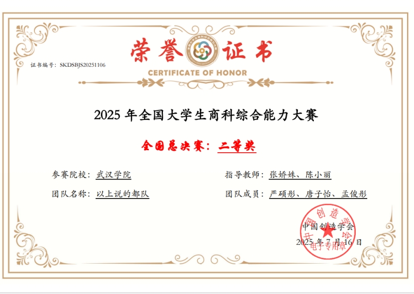 7月13日,2025年全国大学生商科综合能力大赛全国总决赛圆满落幕。由PG电子会计学院陈淑颖和金融与经济学院刘佳一、周蓝兰组成的代表队获得一等奖,另有5个代表队获得二等奖,会计学院教师张娇姝和王惠清获得“优秀指导老师奖”。