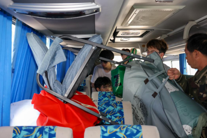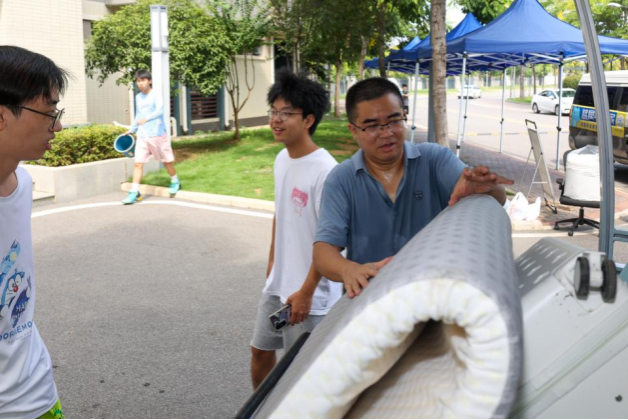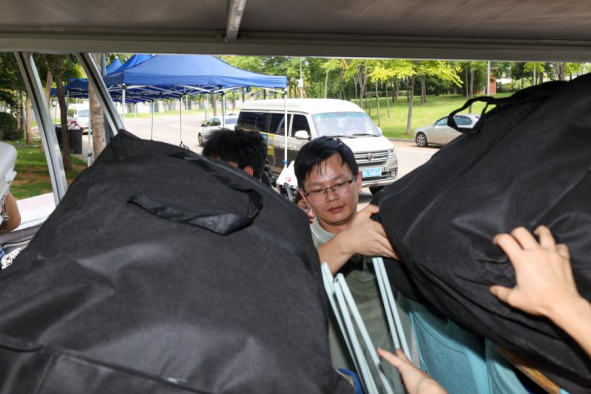 法学院党总支副书记田强当起了临时摆渡车司机,顶着炎炎烈日在宿舍楼栋之间来回奔波。辅导员和教师们安排了货车、三轮车、私家车、手推车,轮番帮助学生搬运行李。学生们一批一批搬完,老师们从清晨忙碌到夜幕降临。