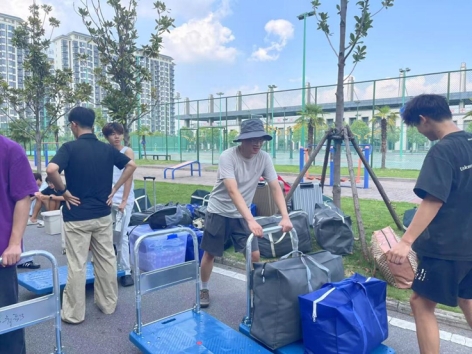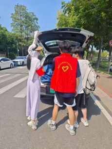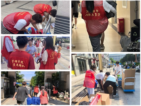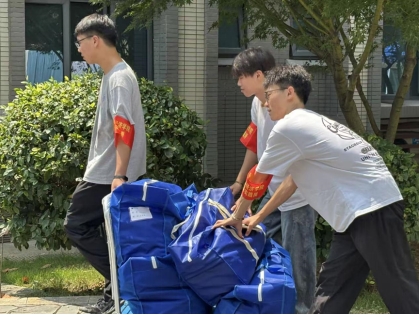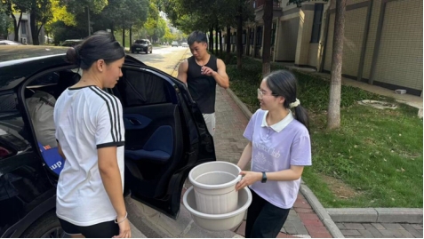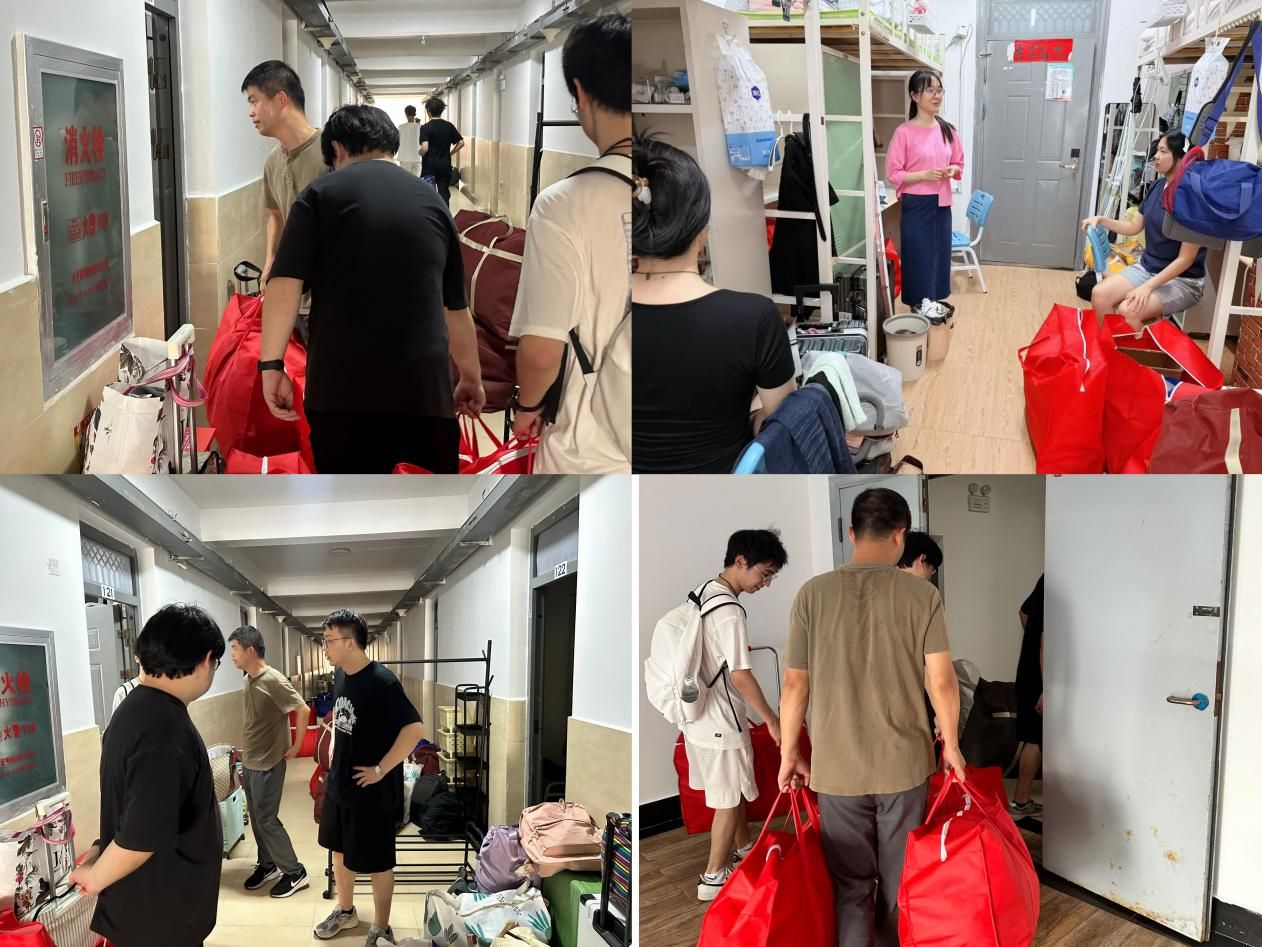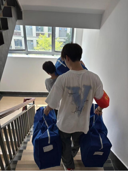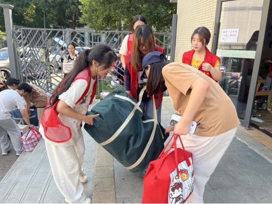 上午7点,太阳已高高升起,尽管酷暑炎热,党员志愿者们早早来到宿舍楼下集合,很多老师们开着自己的车,学生带着推车等搬运工具,与需要协助搬运行李的同学对接后便迅速投入工作。大家表现出高度的责任感和饱满的工作热情,面对装满书籍的行李箱、厚重的被褥包裹等重物,他们主动上前、接力搬运。即使汗水浸透衣衫,志愿者们始终保持着耐心与细致,小心避免物品磕碰损坏,确保了同学们财物安全。