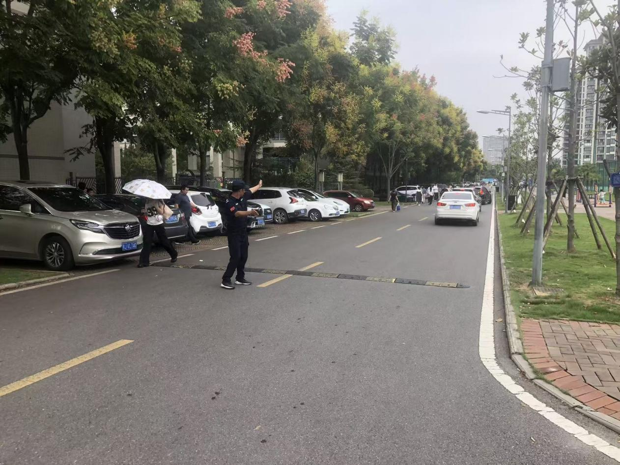 “车辆请往这边走,即停即下,谢谢配合!”无需烈日当头,保安吴师傅的衣服已被汗水浸湿,但他仍然坚守在路口,指挥来往车辆。迎新日校园交通的顺畅有序,离不开他们的辛勤付出。