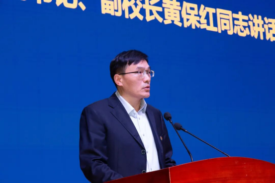 校党委副书记、副校长黄保红总结讲话。他首先向获得表彰的集体和个人表示祝贺,并向辅导员、班主任、学生干部及全体同学致以敬意和问候。他总结了过去一学年的工作成绩,指出在“十四五”收官之年,学校学生工作实现了系统性提升:一是育人体系更加健全,“一站式”学生社区模式深化,学风建设与文化节协同发力;二是招生就业量质提升,生源质量稳居同类高校前列,毕业生初次就业率超过全省平均水平;三是创新创业取得新成绩,师生在多项省级以上竞赛中获奖,创业氛围浓厚;四是实践育人品牌响亮,“三下乡”社会实践参与率超98%,志愿服务深入推进;五是辅导员队伍专业化水平不断提升,为学校高质量发展提供了重要支撑。