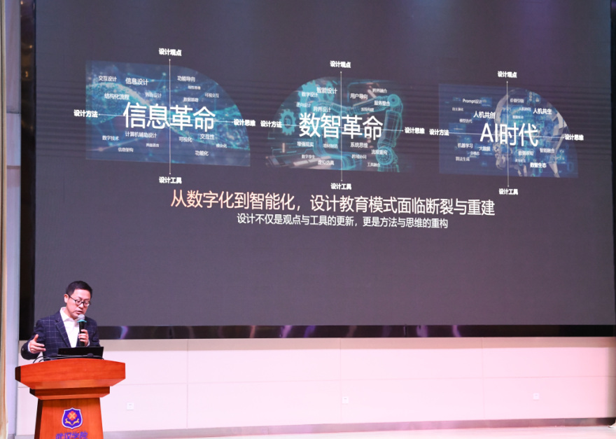 湖北工业大学艺术设计学院院长饶鉴教授分享了该校在智能设计教育领域的实践经验,提出"AI赋能、设计驱动"的新型教学模式,强调艺术设计教育必须紧跟技术变革,培养创新型复合人才。