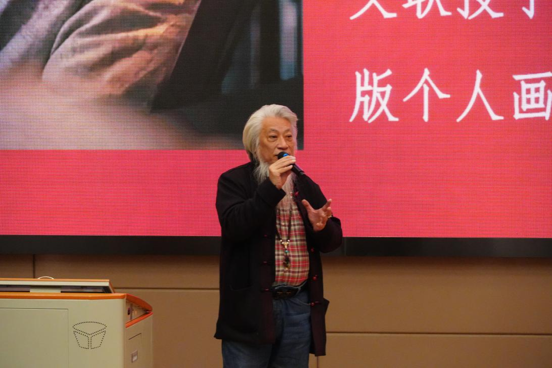 丁竹君在随后的交流发言中分享了自己四十余年与书画“死磕”的心路历程,从临摹《兰亭序》到用现代构图诠释传统山水,强调艺术的真谛不在于“像不像”,而在于“真不真”——即真诚表达自我眼中的世界。他鼓励学生勇敢打破“标准答案”的束缚,在传统与创新的碰撞中找到属于自己的艺术语言,并期待与师生共同“让美育的种子在校园里长成参天大树”。