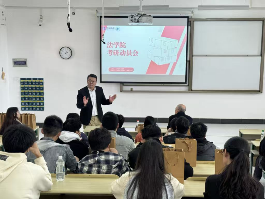 法学院以“政策领航+经验引路”为主题,开展考研动员活动。院长王广辉结合法学学科优势作动员讲话,为学子讲解考研对拓宽法律职业路径的重要意义。党总支副书记田强详细解读了学校最新的考研奖励政策,结合近年报考数据、上岸案例分析备考形势,为学子指明方向,并为大家送上精心准备的考研福袋。