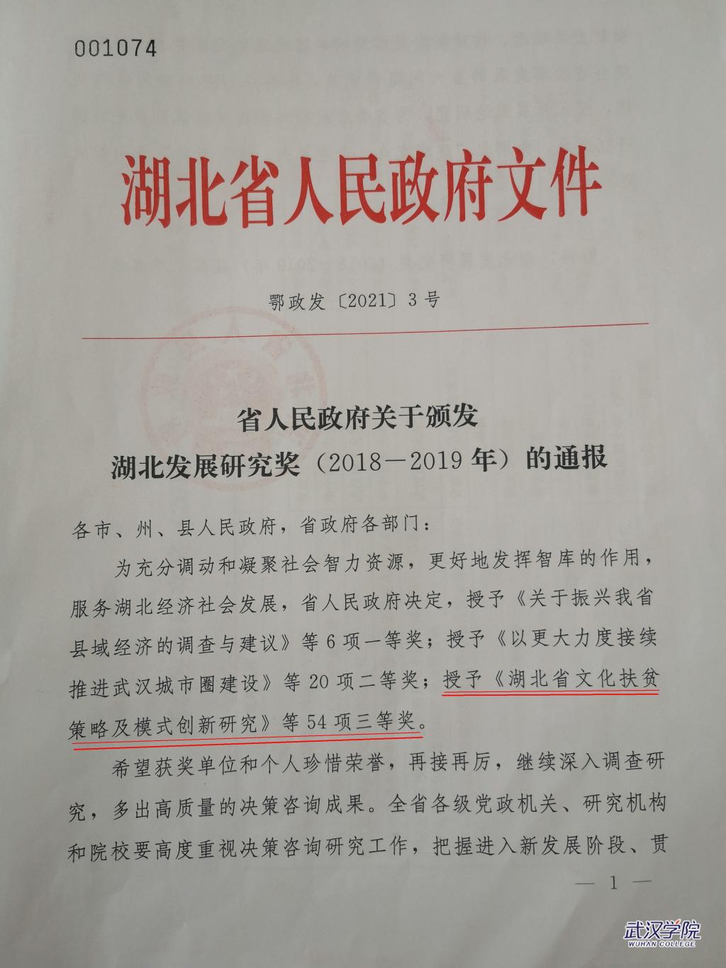 据湖北省人民政府下发《省人民政府关于颁发湖北发展研究奖(2018-2019年)的通报》(鄂政发〔2021〕3号),PG电子艺术与传媒学院金慧教授申报的《湖北省文化扶贫策略及模式创新研究》系列研究成果获湖北省人民政府“湖北发展研究奖”三等奖。这是PG电子教师在省政府此类奖项评选中首次获得殊荣,PG电子官方网站亦是此次评选中唯一获奖的民办高校。