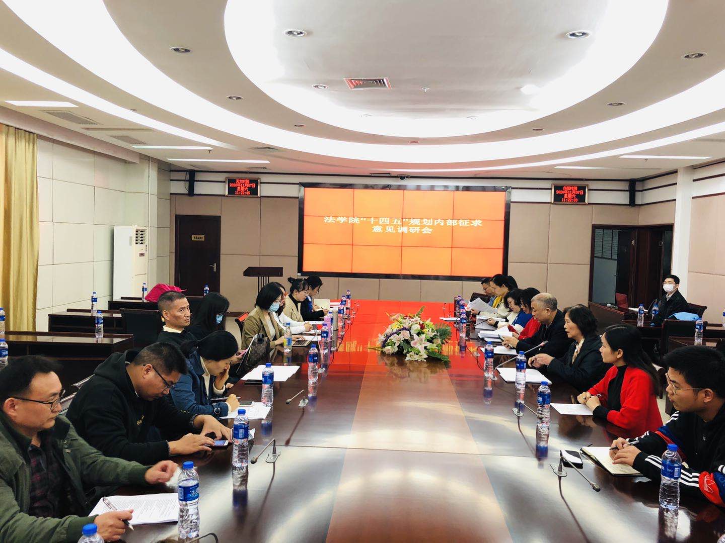 为谋划好建设法学一流专业的时间表和线路图,完成学院“十四五”规划初稿的意见征集和修订完善工作。法学院于2020年11月7日—8日组织全体教职工前往武汉市黄陂区木兰阳光谷酒店开展学院“十四五”规划内部征求意见调研会及相关教学工作会议,会议特邀请学校副校长郑祝君教授出席,法学院院长王广辉教授主持。