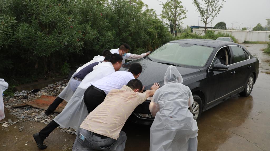 在田径运动场旁边的停车场,一名新生家长不小心把车开过隔离墩,动弹不得。后勤保障处和金地物业8名工作人员赶来,齐心合力化险为夷。