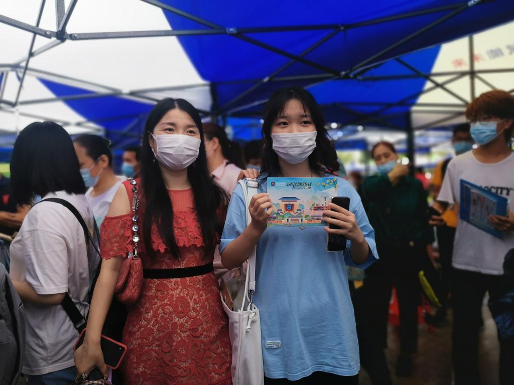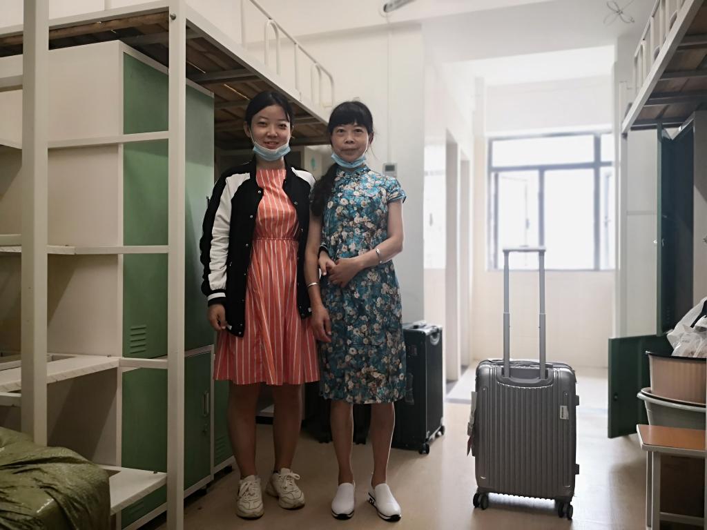 邓蜜的妈妈穿了一身红裙子陪她来报到,她说,希望女儿的大学生活红红火火。