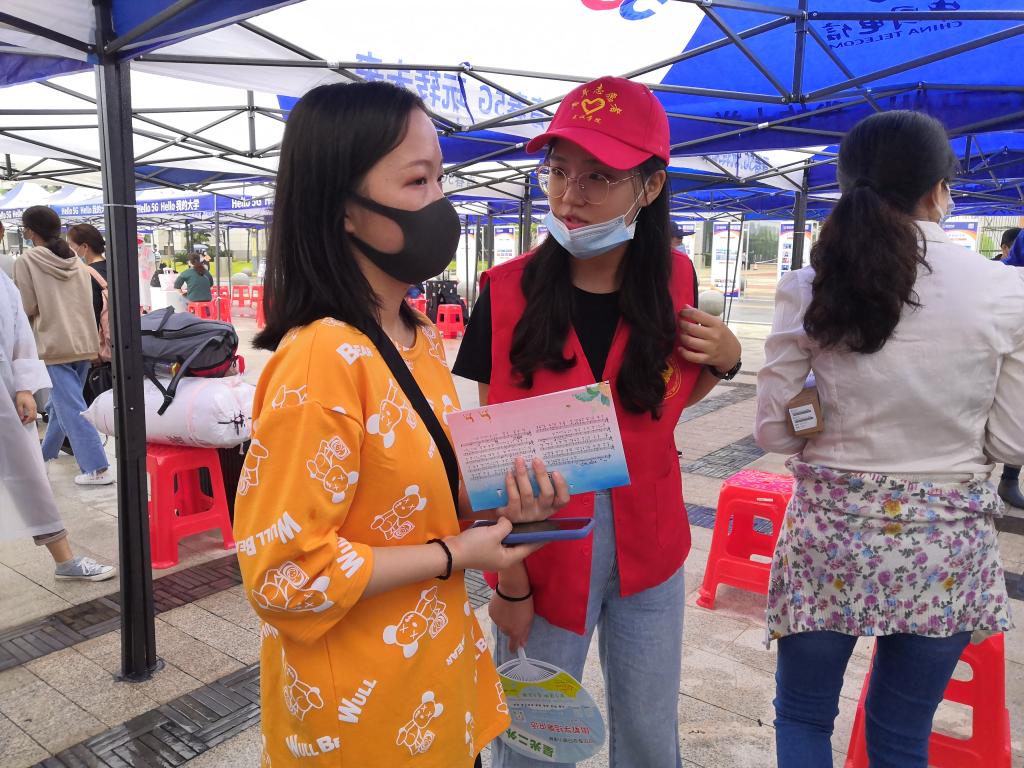 男生志愿者承担了大部分“体力活”,扛的最重的是学生手册,一人扛了四五麻袋到迎新点。女生志愿者主要负责迎接和指引,会计学院2019级志愿者马明哲早上6点多就开始奔波于迎新现场,半天走了两万多步。