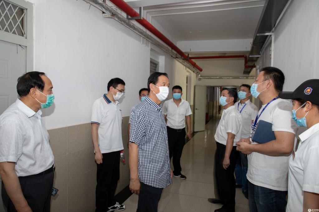 校领导一行先后检查了东一门人行岗、东二门机动车岗、毕业生宿舍情况及退宿流程、毕业生返校食堂就餐安排、校园水泵房生活水箱水质情况以及隔离点现场物资准备工作。