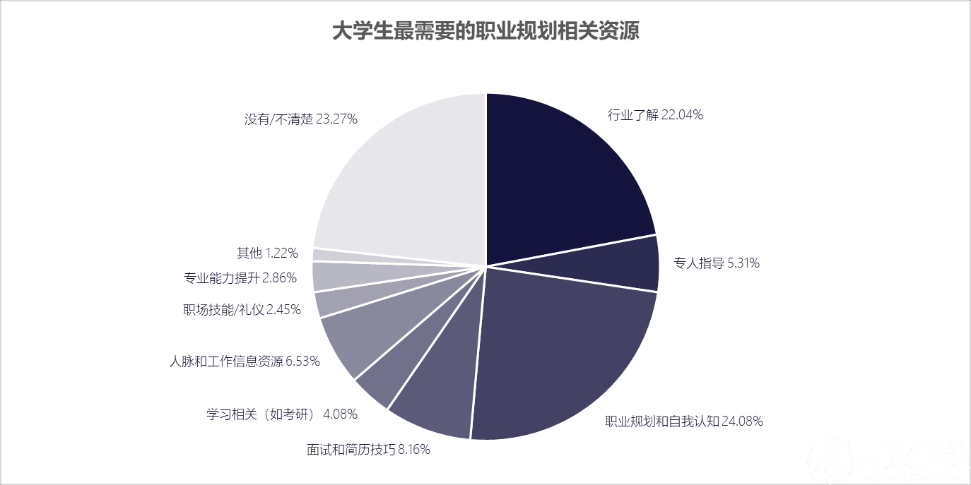该计划在4-5月通过优先报名进行了一场迷你调研,了解大学生最需要的职业规划相关资源是什么。调研询问了全国22家高校共245位大学生,其中又以大三和大四毕业生为主(占总人数约70%),发现他们最需要职业规划与自我认知方面的协助,占总人数24.08%,而认为对行业认知不足的占22.02%,面试和简历技巧和人脉和工作信息资源等则分别占比8.16%和6.53%。