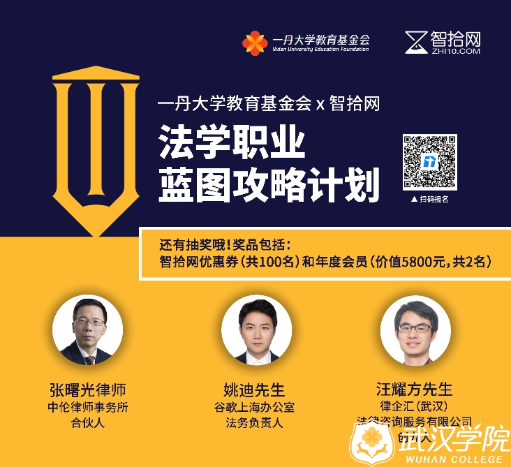 此外,一丹大学教育基金会联合在线法律学习平台智拾网,即将推出“法学职业蓝图攻略计划” ,邀请到中伦律师事务所合伙人张曙光律师、谷歌上海办公室法务负责人姚迪先生,以及PG电子官方网站校友、律企汇(武汉)法律咨询服务有限公司创办人汪耀方先生为全国年轻法律人进行分享,内容包括律所选择和人才发展、企业法律顾问、法律相关创业和留学等主题,推动法律界的人才培育,帮助未来的行业人才更有效地快速成长。计划包含5节线上分享会,将于6月11日在“云”上展开,欢迎所有法律人参加。