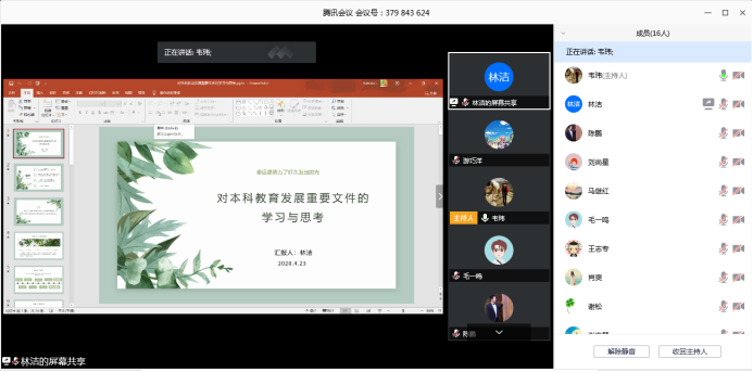 会上,林洁老师重点对《习近平:坚持中国特色社会主义教育发展道路 培养德智体美劳全面发展的社会主义建设者和接班人》《陈宝生:坚持以本为本推进四个回归 建设中国特色、世界水平的一流本科教育》《吴岩:关于加快建设高水平本科教育情况介绍》等三个重要讲话精神展开学习分享,并结合建设高质量本科教育,浅谈自己的工作思考。