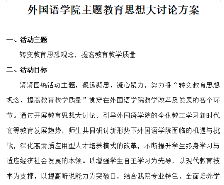 外国语学院本次主题教育思想大讨论动员会,吹响了主题教育学习活动的号角,使全院教师进一步明确了主题教育学习活动的使命,统一了思想,认准了目标,外国学院全体师生将把主题教育思想大讨论各项学习活动落实到实处,为培养适应经济和社会发展需要的高素质应用型人才而努