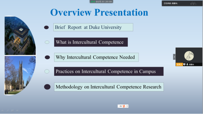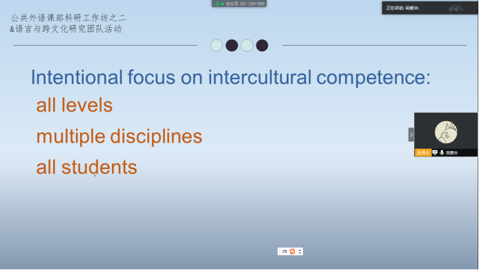然后,吴爱华博士分别从“什么是跨文化能力”,“为什么需要跨文化能力”,“校园里的跨文化实践”和“跨文化能力研究原则”四个方面展开交流。她认为,跨文化能力研究从上个世纪80、90年代以来,迄今有30多年的历史。在全球化和学科研究不断发展的背景下,跨文化能力的概念多达30-40种。目前已经成立了以AIEA和ACIC为代表的国际、国内专业组织,有专业的学术期刊、年会等常规活动。她援引AIEA专家之一——Dr. Darla Deardoff在接受访谈中的观点,“ 跨文化能力的概念扩大了。它不仅仅是跨越边界,也不仅仅是关涉中国或美国。它可能是在代际之间,也会越来越多体现在性别之间、城市和农村之间。” 吴爱华博士认为,跨文化能力实践所具有的所有层次、多学科性和面向所有学生的特点,给跨文化能力研究提供了广阔的空间。