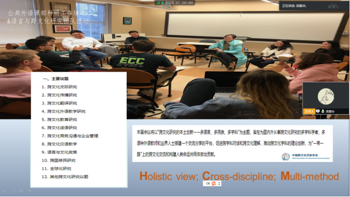 她以中国跨文化交际学会2020年会的议题为例,说明了跨文化能力研究的多学科性以及建立整体性研究视野的重要性和必要性。她联系目前全球抗击疫情中的热点问题,提出要在跨文化能力研究中,建立非西方的研究立场和视角,讲好中国故事。