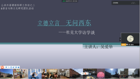 吴爱华博士是2019-2020美国杜克大学东亚系的访问学者。她从刚结束的访问学习开始分享。首先,她简单介绍了杜克大学以及她所在的东亚系情况。杜克大学(Duke University)创建于1838年,其前身是Trinity College of Arts & Sciences,坐落于美国North Carolina的Durham市,是一所世界顶级的研究型大学,也是全美最优秀的大学之一、美国南部最好的私立大学。
